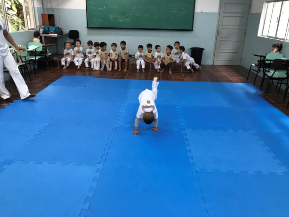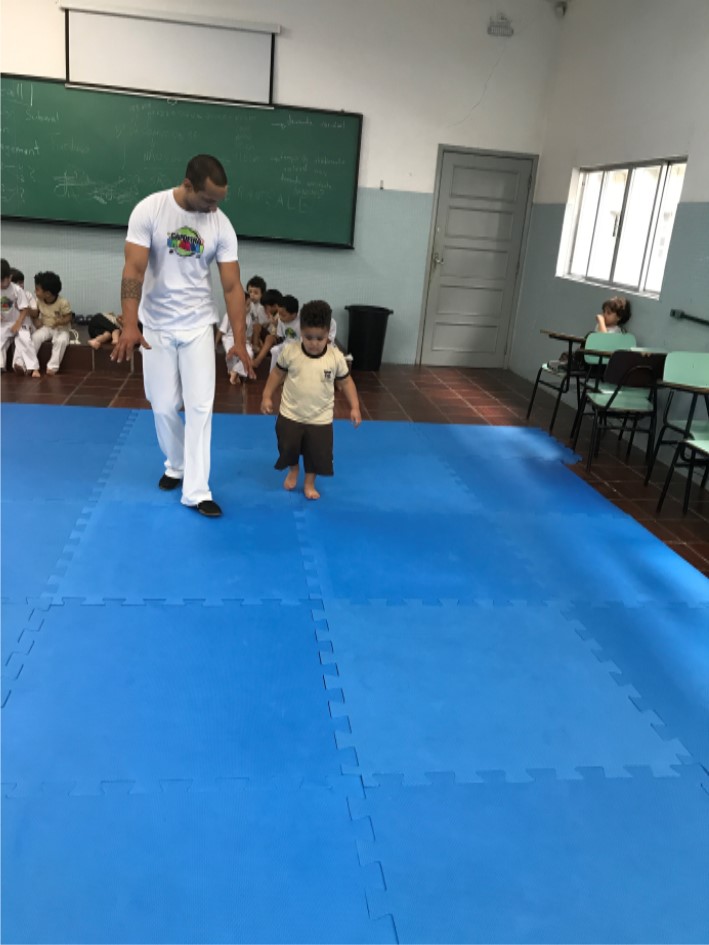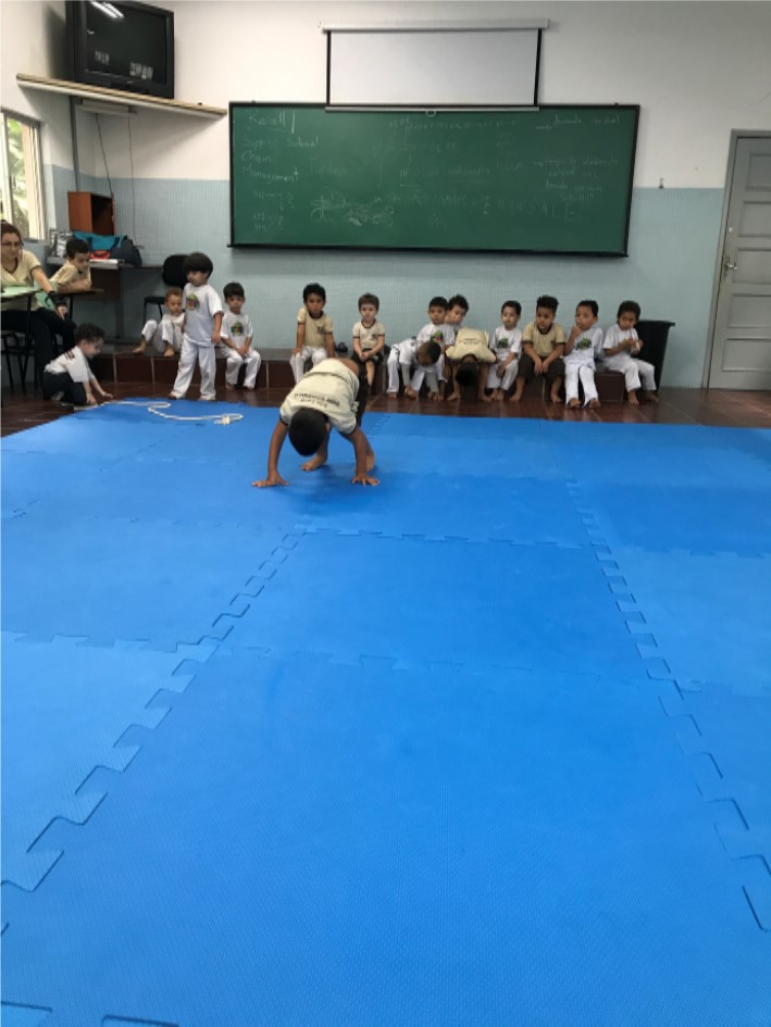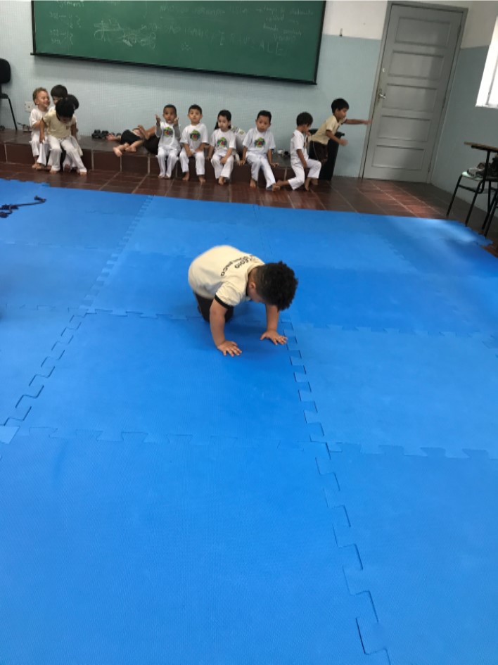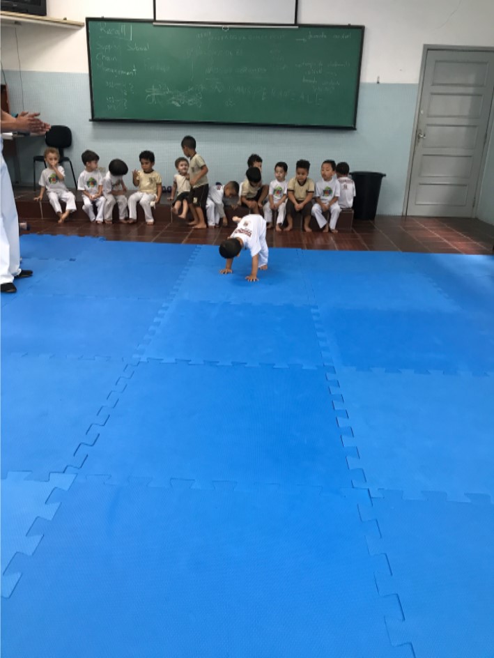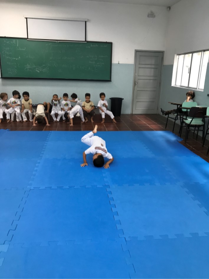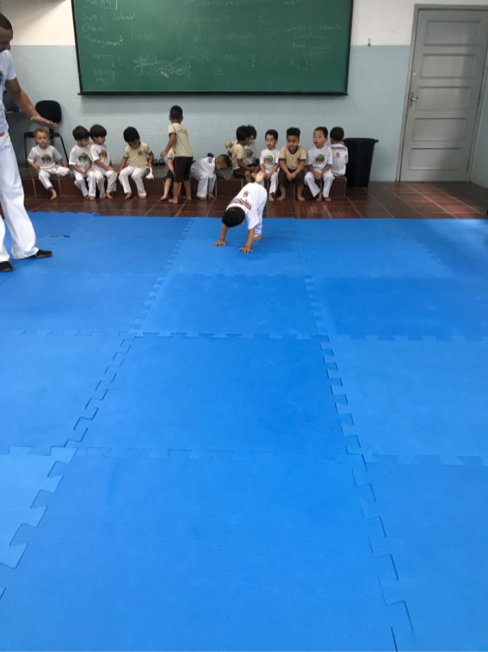 Uma das atividades consistia na execução de movimentos característicos como: a Ginga, movimento básico de Capoeira. Em vez de o capoeirista se fixar numa posição, ele está sempre em movimento, efetuando esta espécie de dança; “Au”, basicamente aquilo a que se chama uma roda, praticada normalmente na ginástica. Também conhecido como Au Regional é usado na Capoeira como uma forma rápida de fugir ou enganar o “adversário”;Cocorinha, que consiste em um método evasivo, nomeadamente consiste na forma de evitar pontapés circulares efetuados em curta distância. Neste movimento é necessário que a mão que toca no solo mantenha o equilíbrio, e, tal como em todos os movimentos e “jogo” capoeirista, é necessário manter sempre o contato visual com o adversário; e Parada de mão. “No Au e na Parada de Mão conseguimos trabalhar a coordenação motora de forma mais específica”, finalizou.
