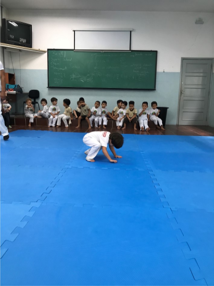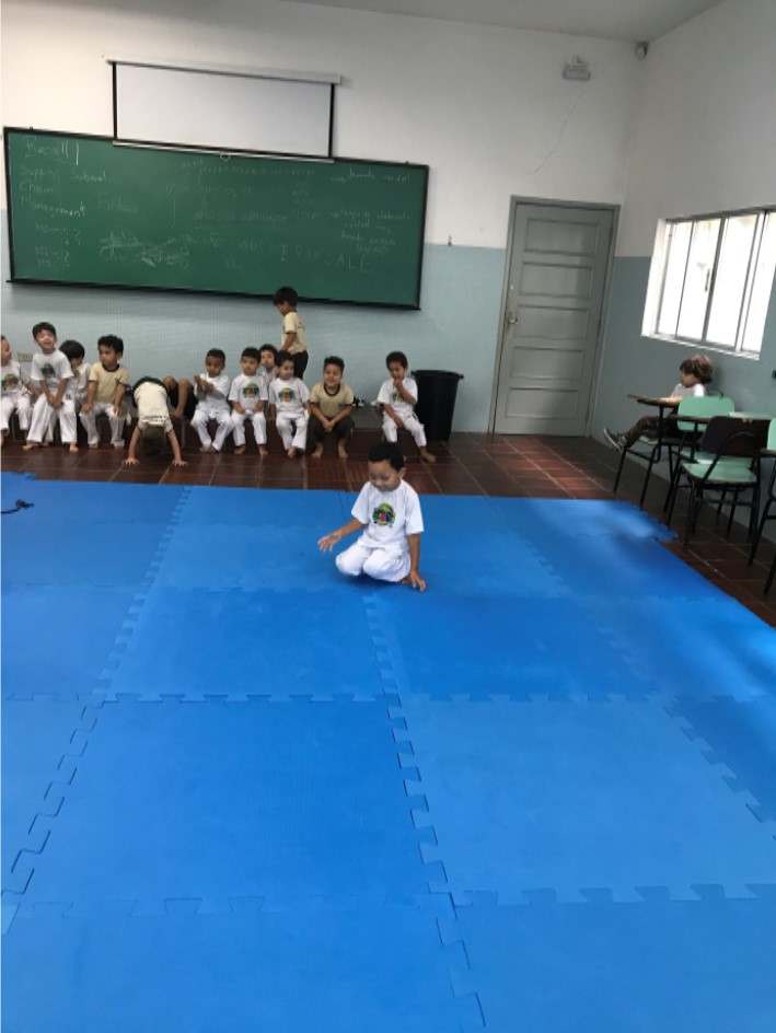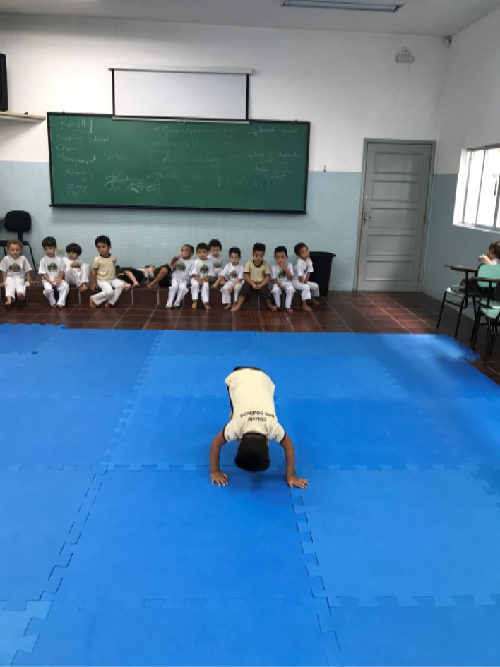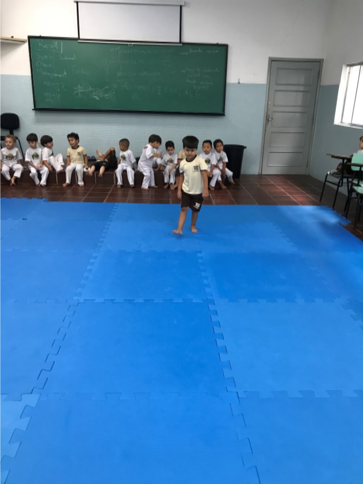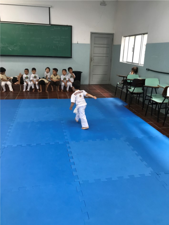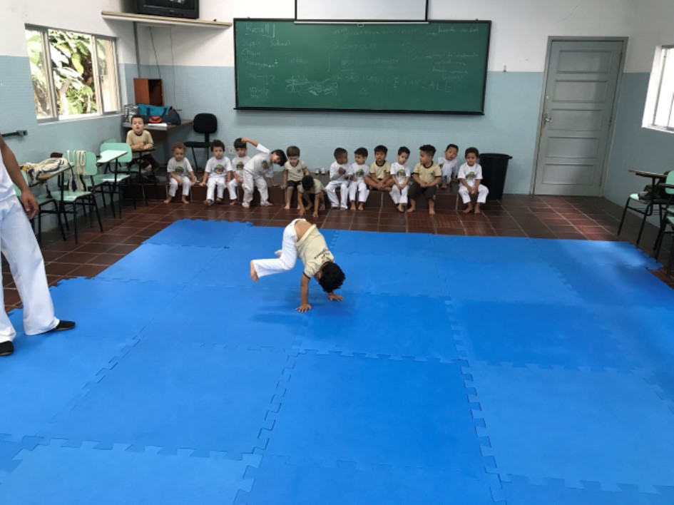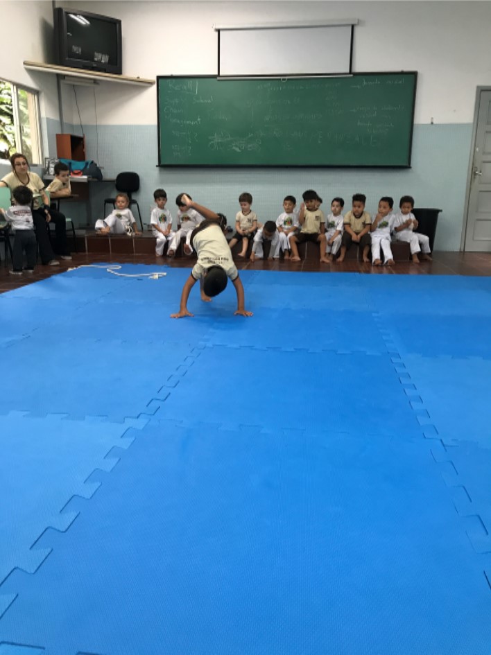 Uma das atividades consistia na execução de movimentos característicos como: a Ginga, movimento básico de Capoeira. Em vez de o capoeirista se fixar numa posição, ele está sempre em movimento, efetuando esta espécie de dança; “Au”, basicamente aquilo a que se chama uma roda, praticada normalmente na ginástica. Também conhecido como Au Regional é usado na Capoeira como uma forma rápida de fugir ou enganar o “adversário”;Cocorinha, que consiste em um método evasivo, nomeadamente consiste na forma de evitar pontapés circulares efetuados em curta distância. Neste movimento é necessário que a mão que toca no solo mantenha o equilíbrio, e, tal como em todos os movimentos e “jogo” capoeirista, é necessário manter sempre o contato visual com o adversário; e Parada de mão. “No Au e na Parada de Mão conseguimos trabalhar a coordenação motora de forma mais específica”, finalizou.