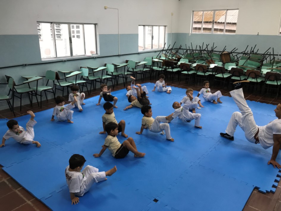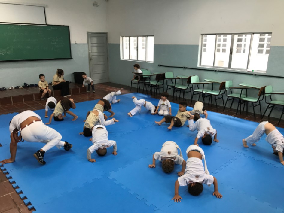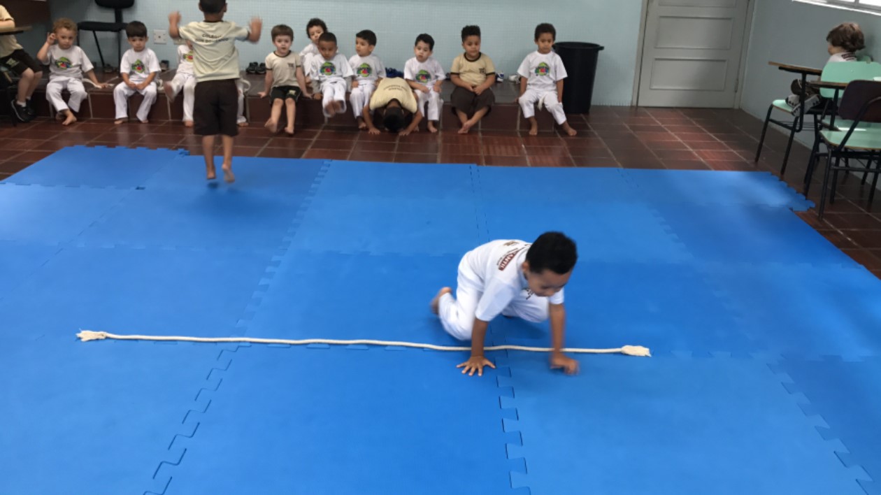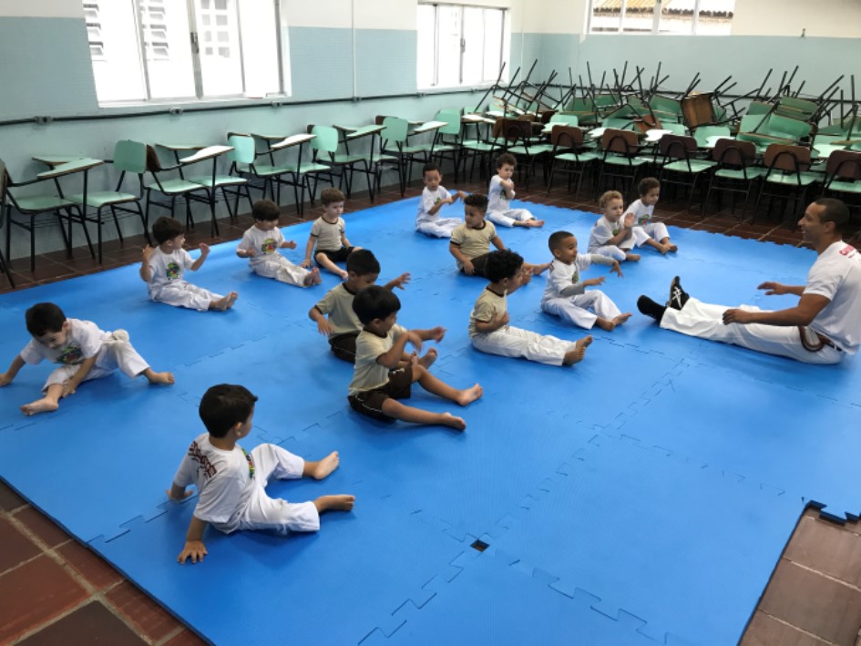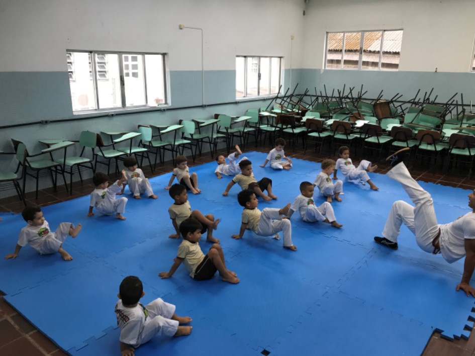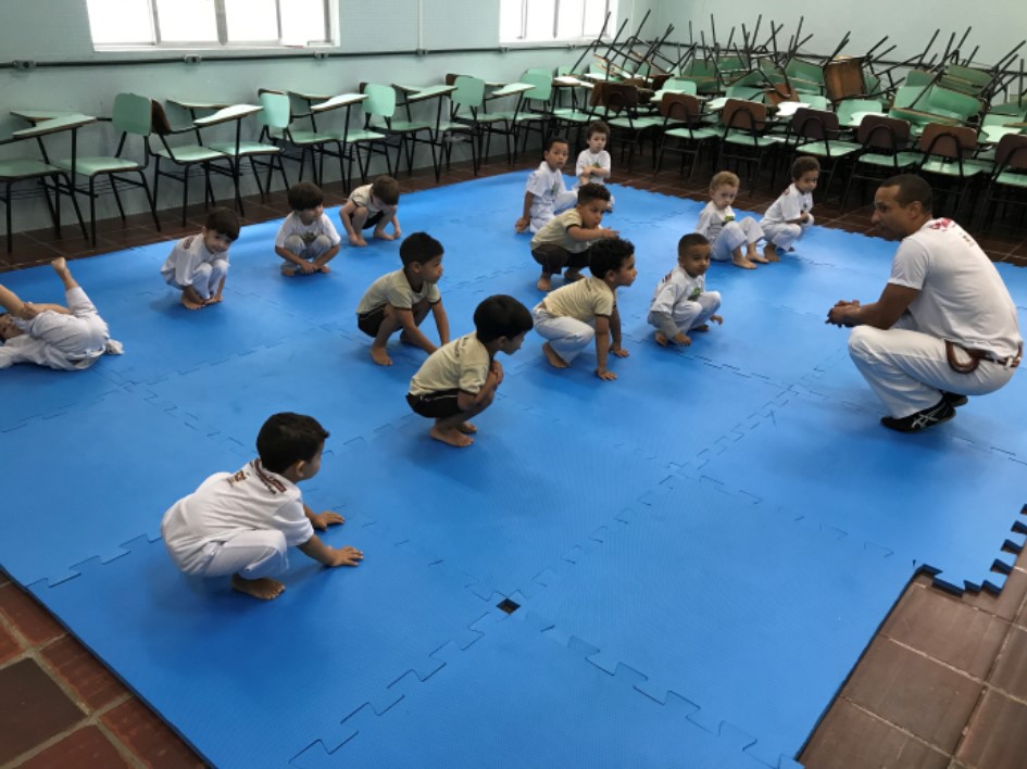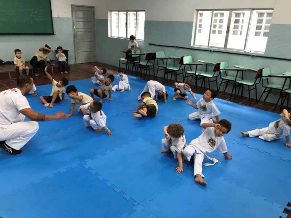 Durante a aula os alunos desenvolvem uma série de movimentos característicos da capoeira. “É importante que, desde pequenos eles aprendam os movimentos que serão a base para um possível treinamento mais específico no futuro”, afirma Rodolfo.