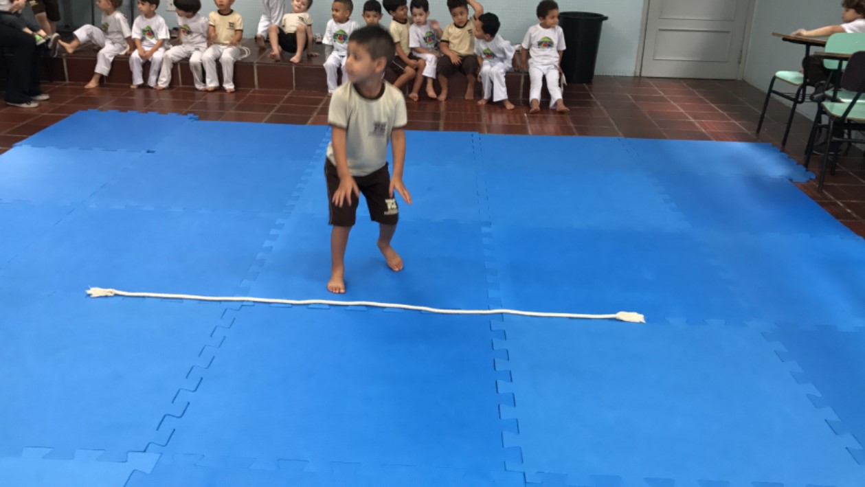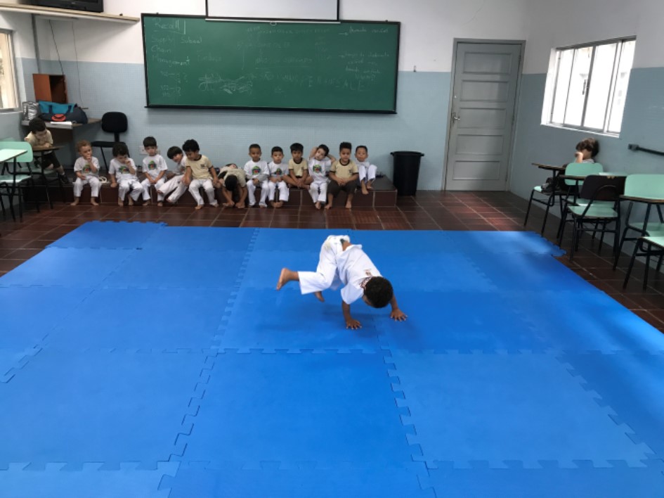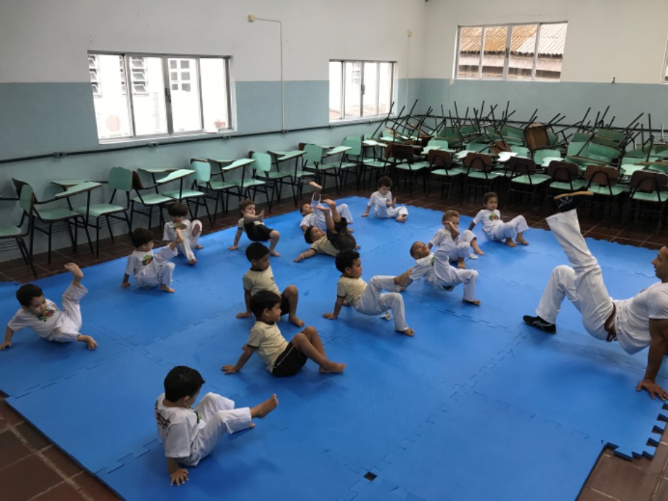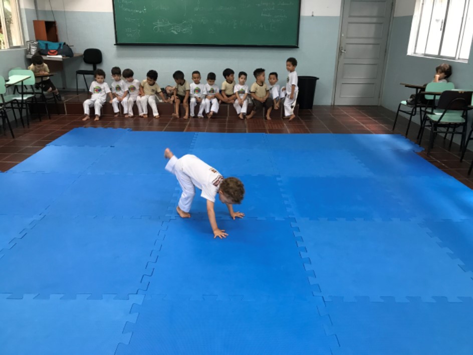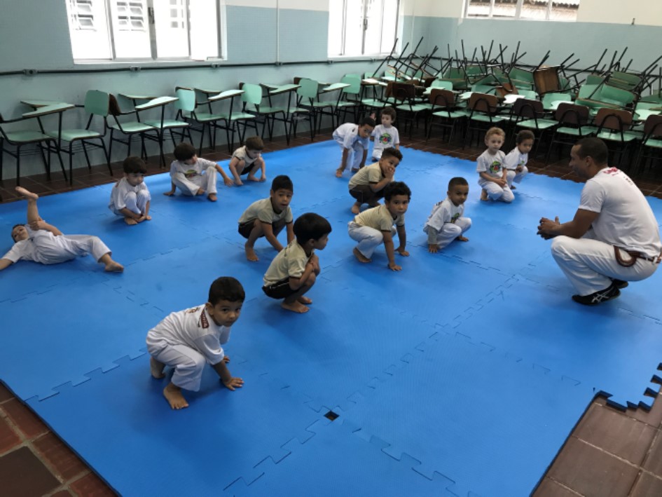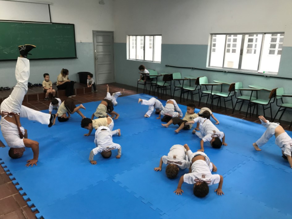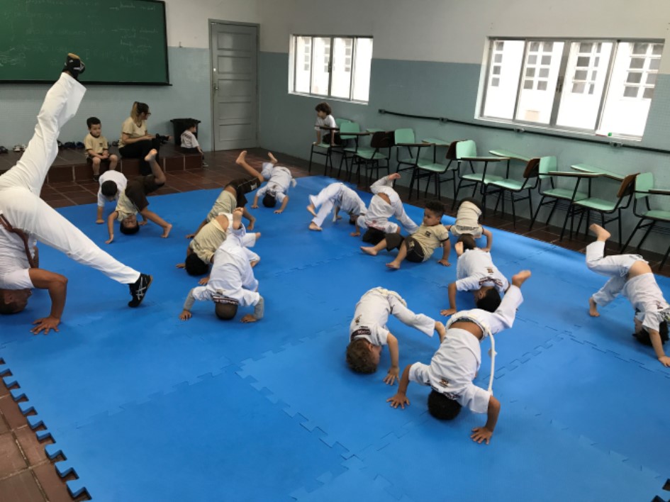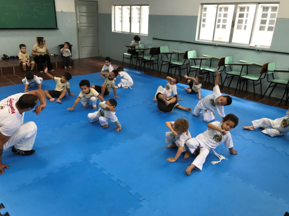 Durante a aula os alunos desenvolvem uma série de movimentos característicos da capoeira. “É importante que, desde pequenos eles aprendam os movimentos que serão a base para um possível treinamento mais específico no futuro”, afirma Rodolfo.