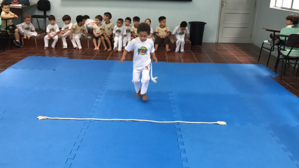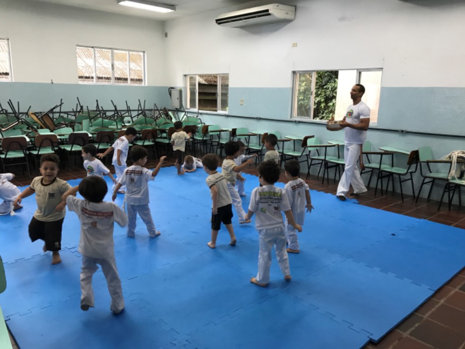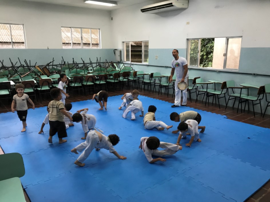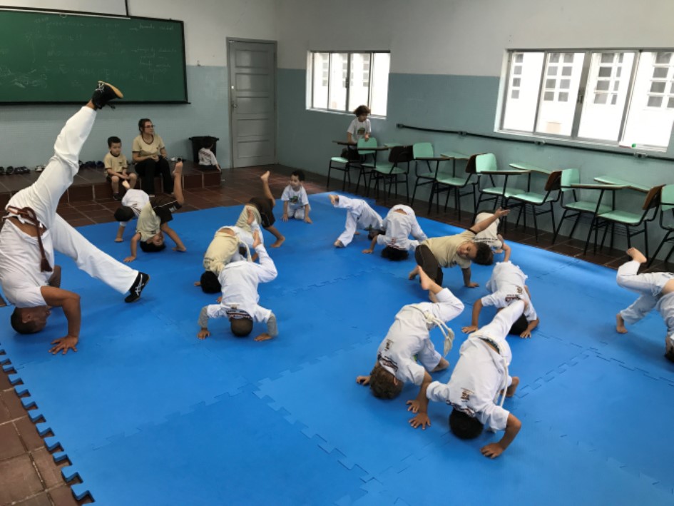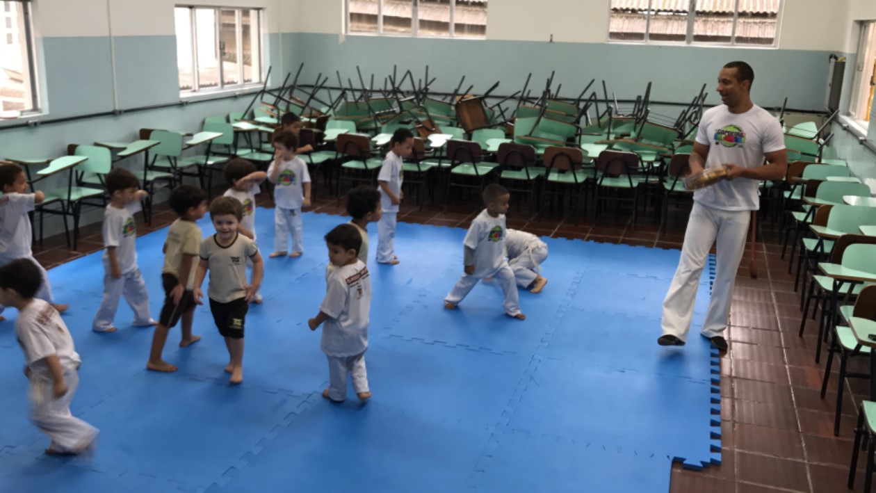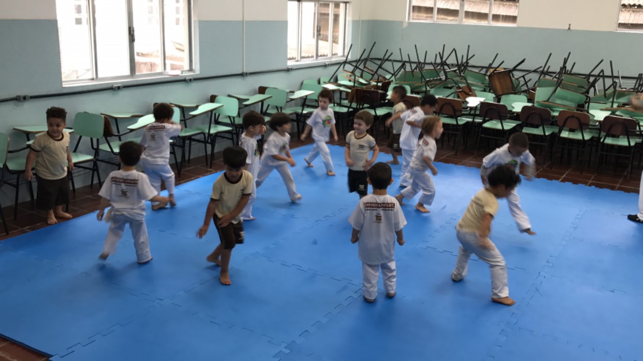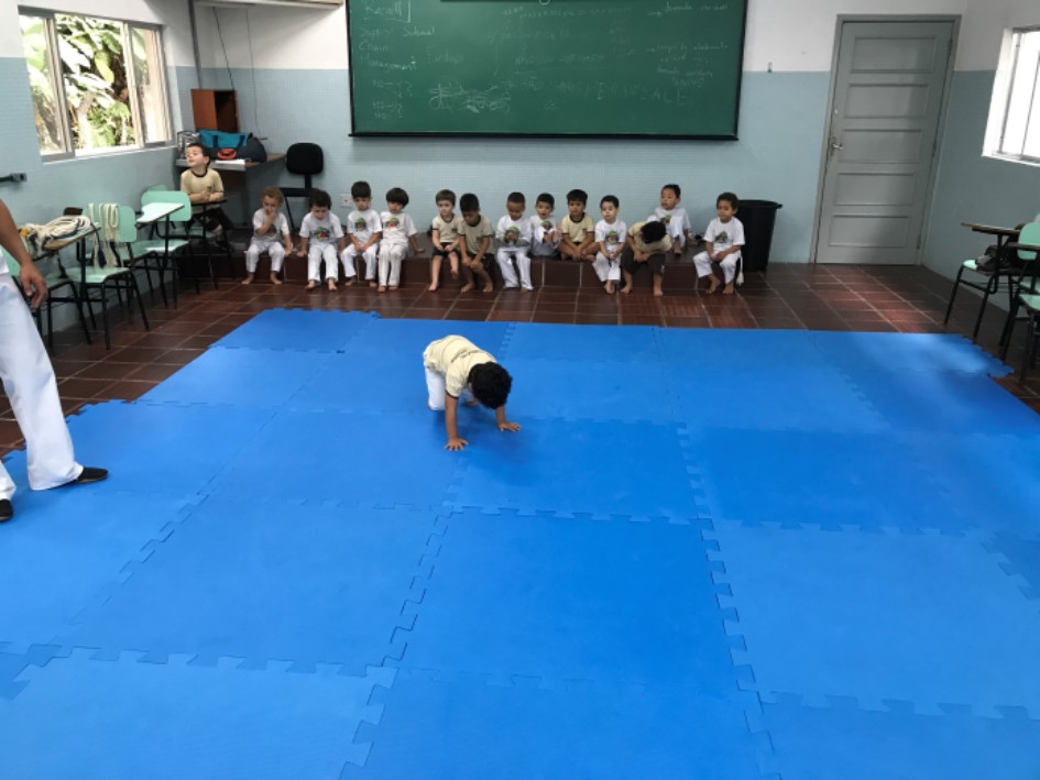 Durante a aula os alunos desenvolvem uma série de movimentos característicos da capoeira. “É importante que, desde pequenos eles aprendam os movimentos que serão a base para um possível treinamento mais específico no futuro”, afirma Rodolfo.