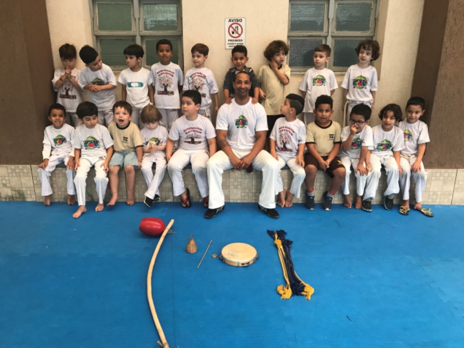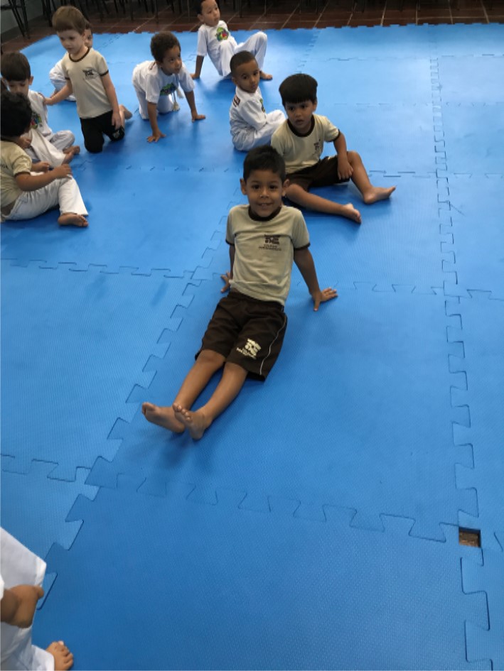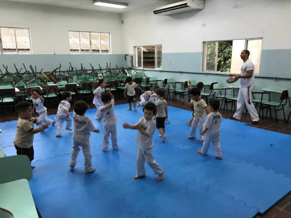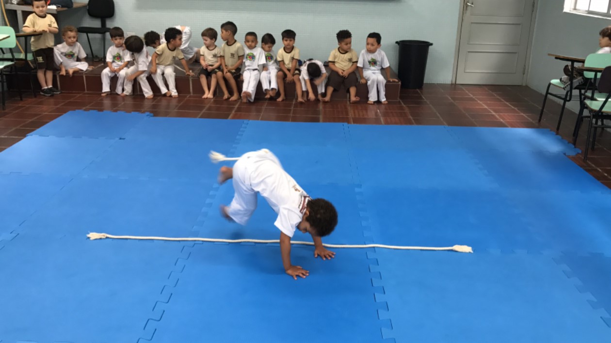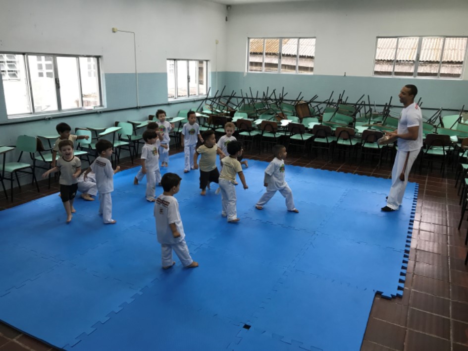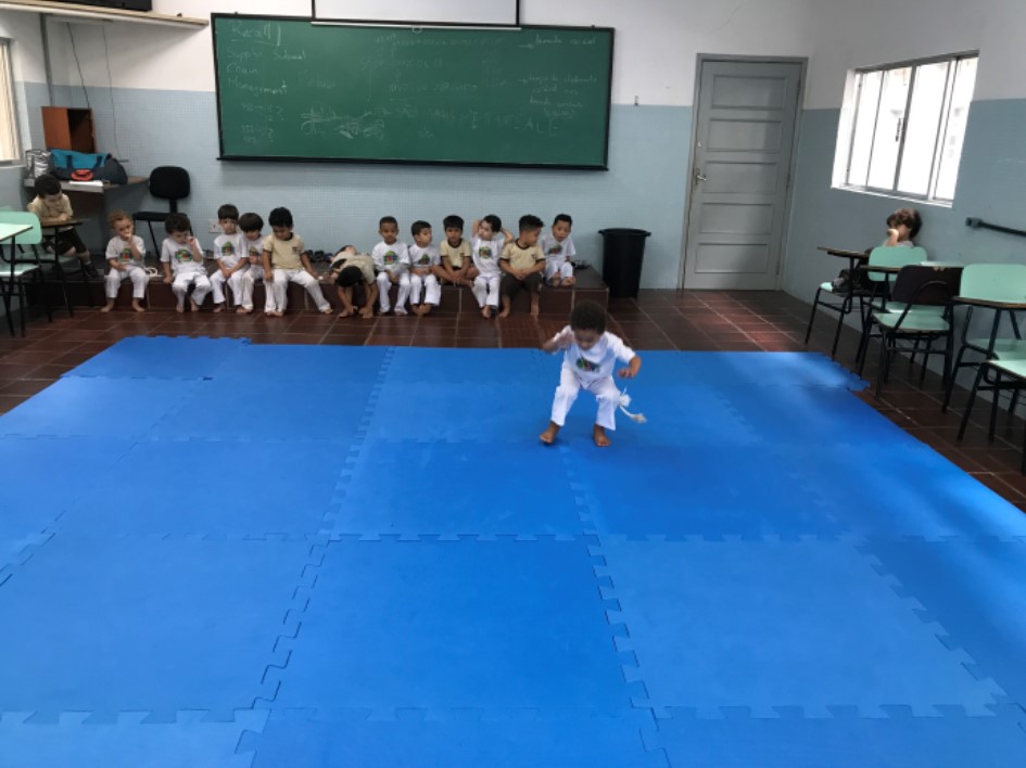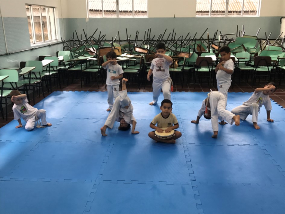 Durante a aula os alunos desenvolvem uma série de movimentos característicos da capoeira. “É importante que, desde pequenos eles aprendam os movimentos que serão a base para um possível treinamento mais específico no futuro”, afirma Rodolfo.