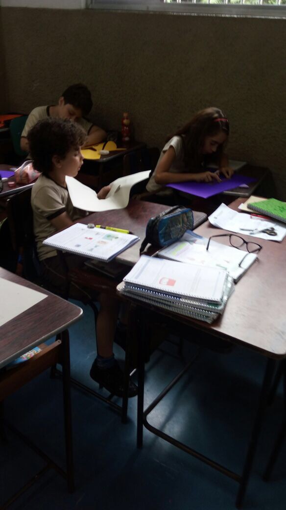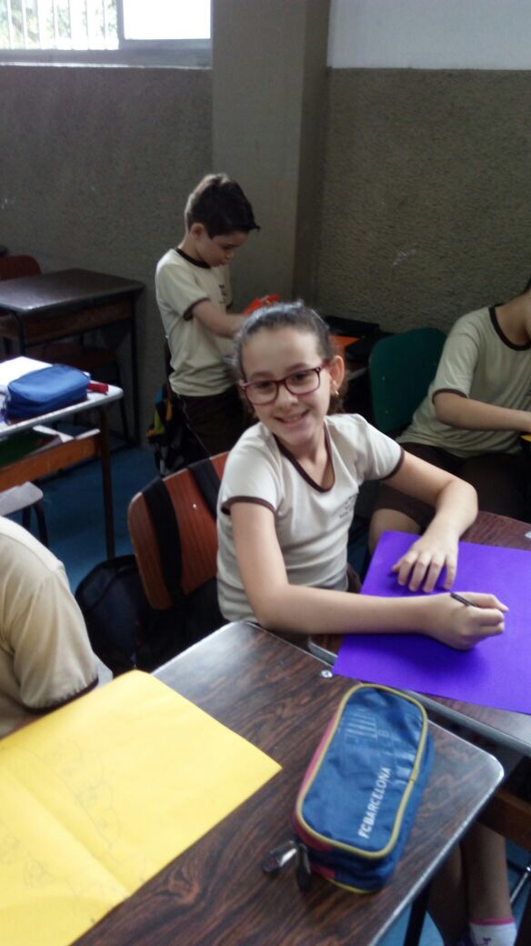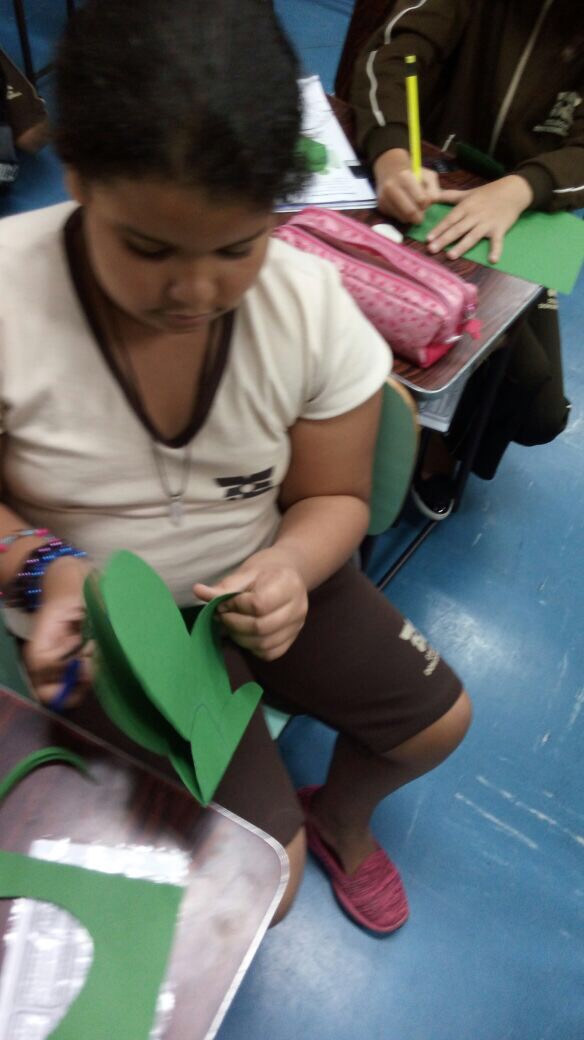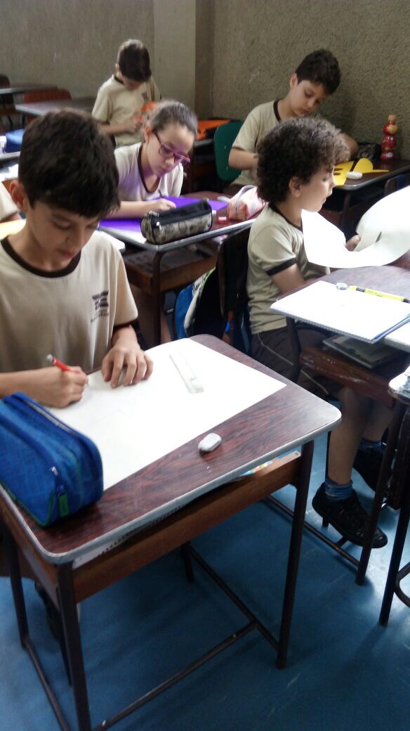 Uma dessas atividades foi realizada no 4At tendo como tema a simetria. “A ideia foi trabalhar o conceito de simetria, suas propriedades e seu papel como ferramenta no estudo de figuras planas e na resolução de problemas de construção geométrica. Para tanto, preparei a sala em formato de U, assim os alunos podiam visualizar o que eu estava fazendo e, também os seus colegas”, explicou. Os alunos receberam material  e tinham que recortar a figura de forma que ela se encaixasse perfeitamente à figura que a Profa. Ieda estava recortando. “Trabalhamos medidas e outras ferramentas neste exercício. Ao colocarem a mão da massa, os alunos aprendem mais”, destacou.