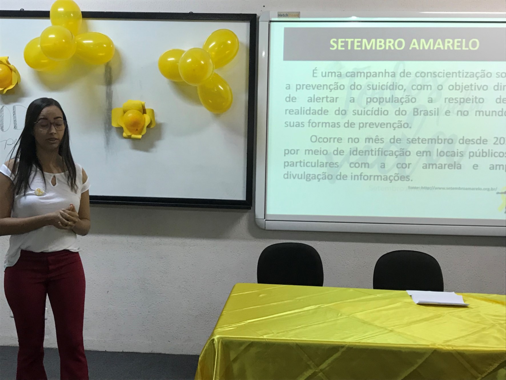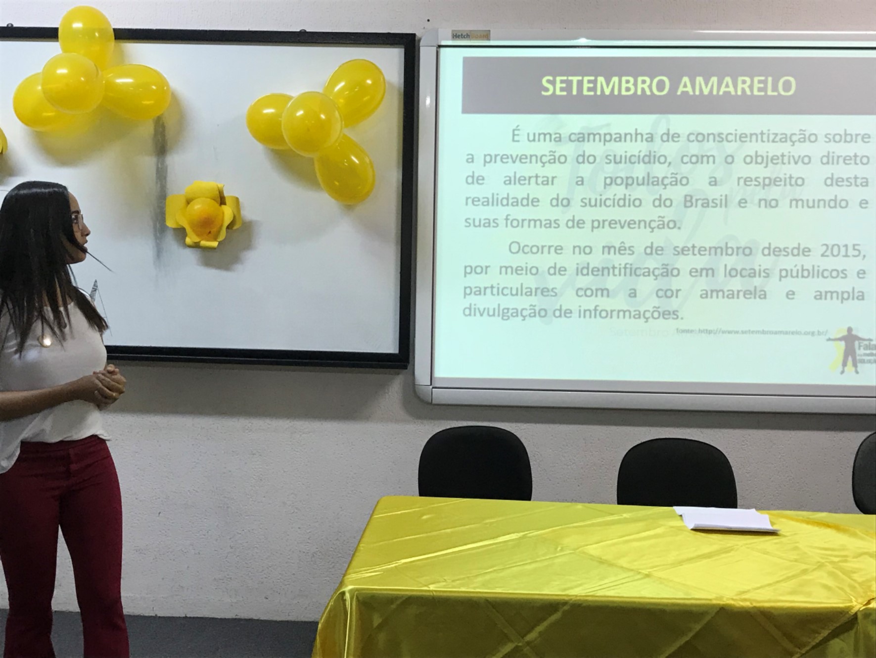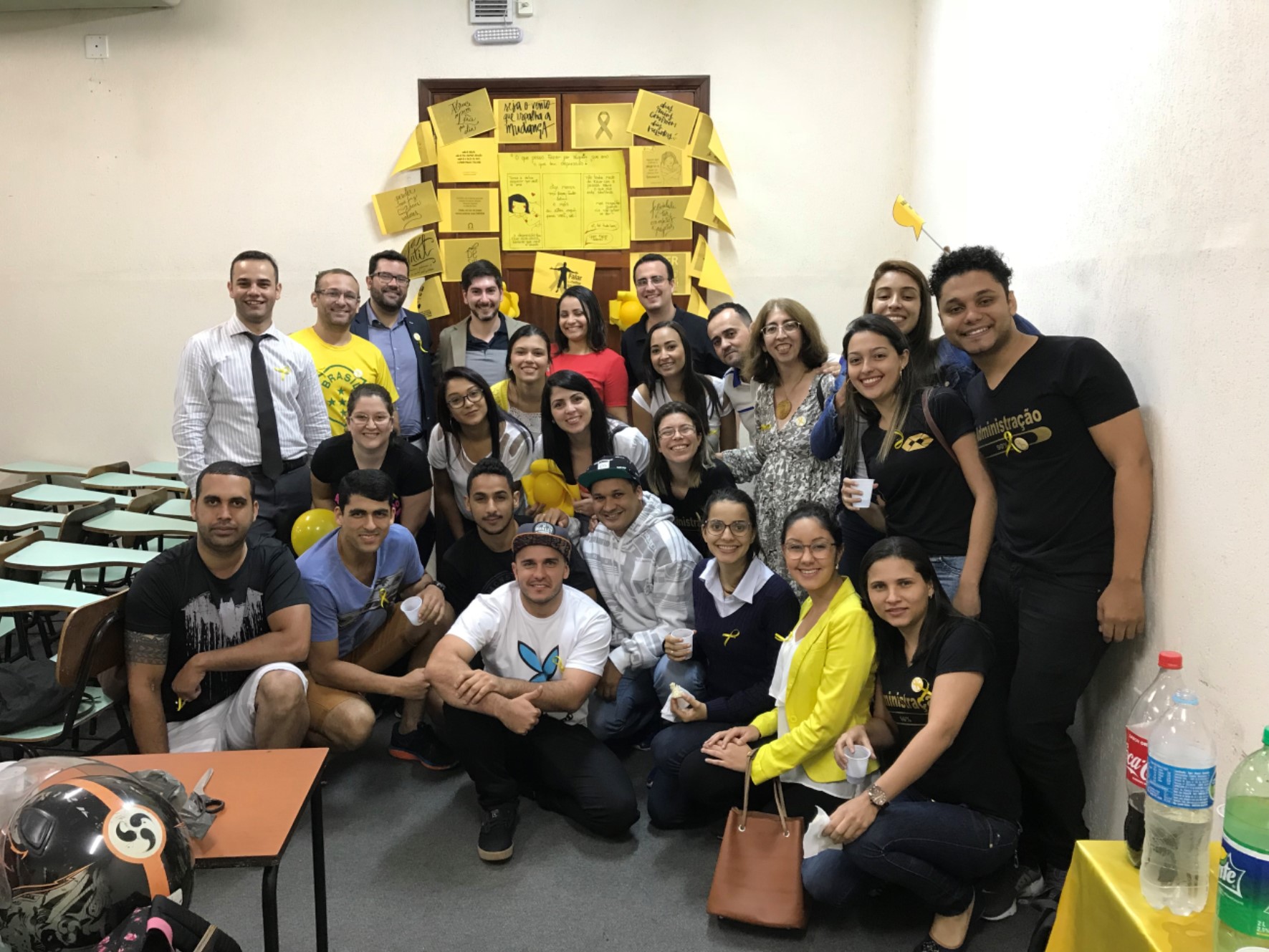 Com o Título “Conscientização do Setembro Amarelo”, o 8º D de Administração promoveu debate a respeito da campanha mundial que ocorre em todo o mês de setembro para prevenção de suicídio. O evento abordou o tema, fazendo ampla discussão a respeito do tema depressão. Para tanto, a turma contou com a participação de três especialistas em diferentes áreas: o Advogado e Professor Universitário, Fabrício Lema, cujo tema da Dissertação de Mestrado é a relação Suicídio/Trabalho, o Psicólogo Luiz Carlos Francisco Junior e a Psicóloga, Suellen Izidoro.