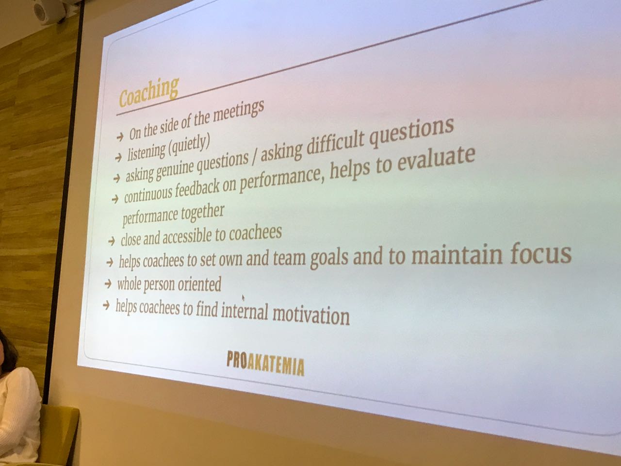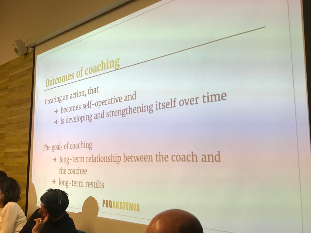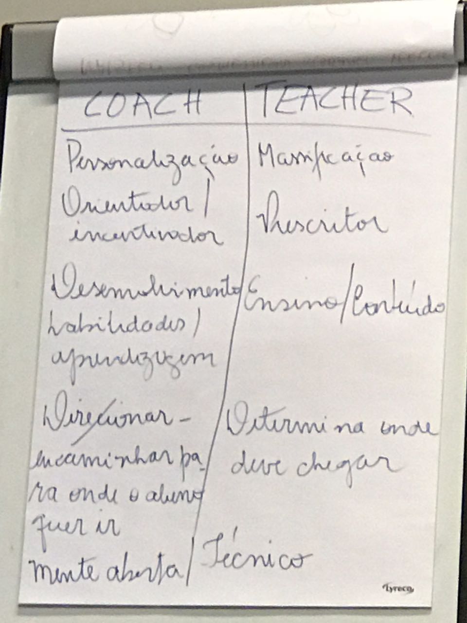 Na parte da tarde, de volta à Proakatemia, aconteceu uma ampla discussão a respeito do papel do coach e do professor. Segundo a equipe da Proakatemia, o coach utiliza 5 valores de base: 1- Criar, 2- Coragem, 3- Fazer, 4- Aprender e 5- Sucesso