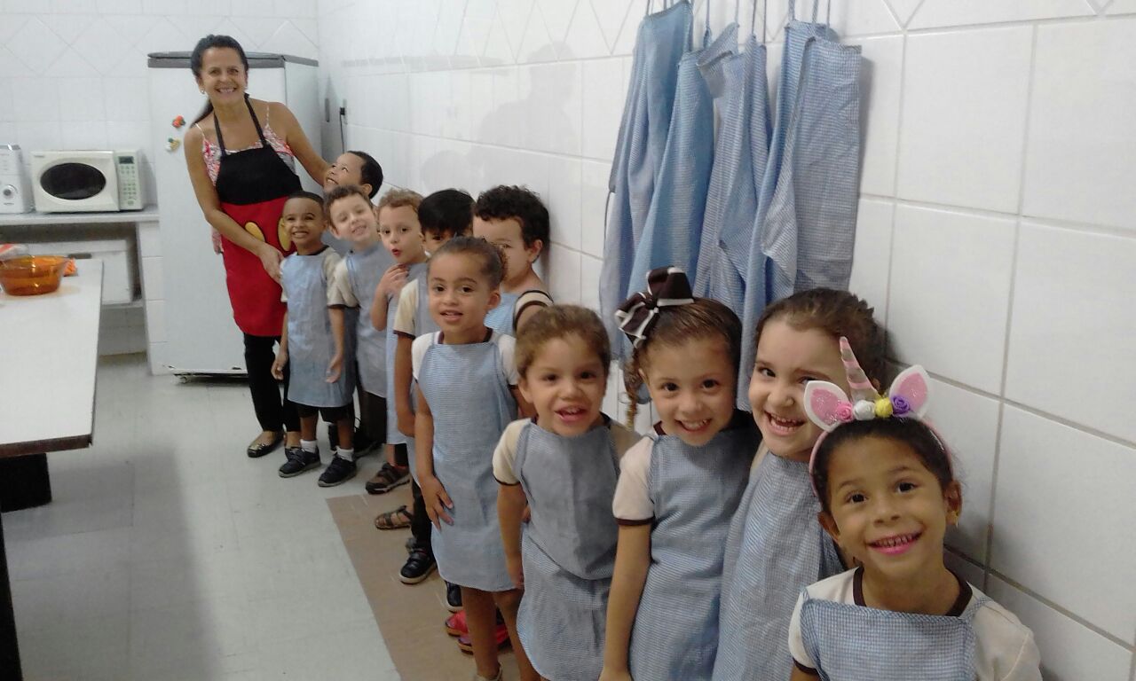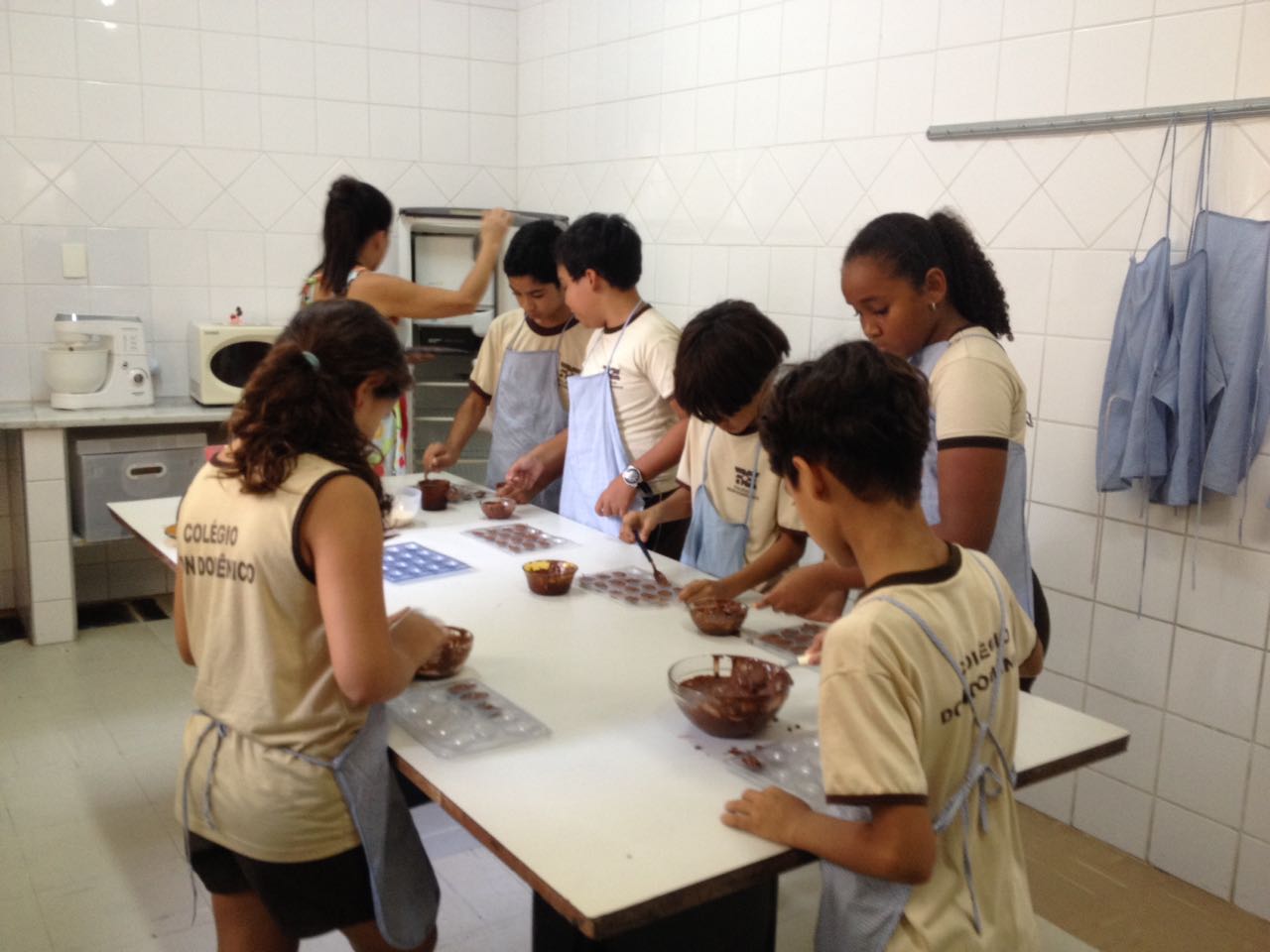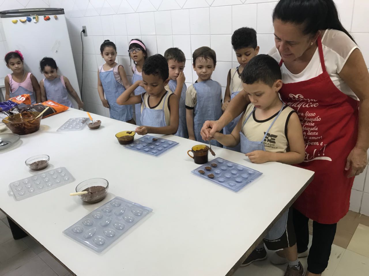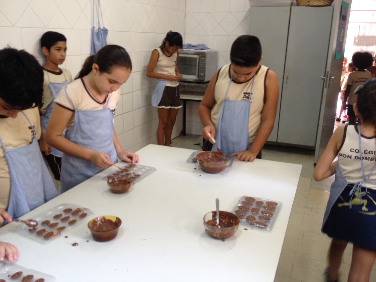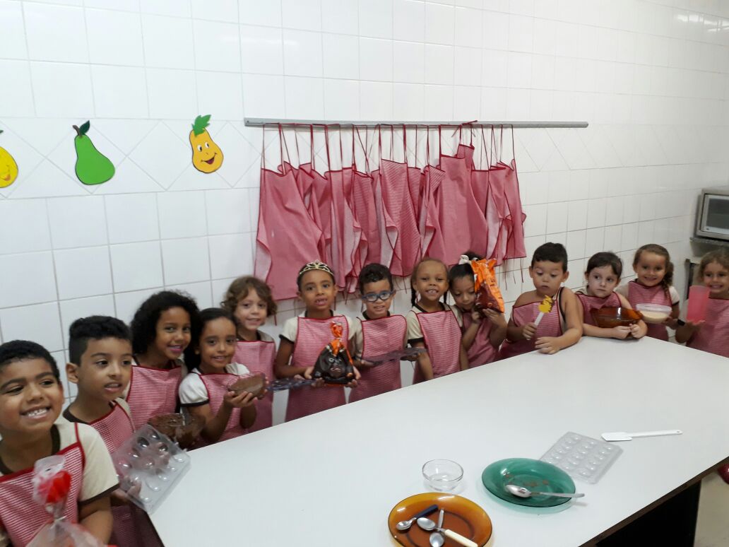 Alunos do Pré I ao 5º Ano do Ensino Fundamental elaboraram receitas de Páscoa durante todo o mês de março, nas aulas de culinária realizadas na cozinha experimental do Colégio Don Domênico. “Aproveitamos essa data tão especial para ensinar receitas de produtos relacionados à Páscoa, tendo o chocolate como estrela”, afirmou a Profa. Lêda, responsável pelo Programa de Culinária.