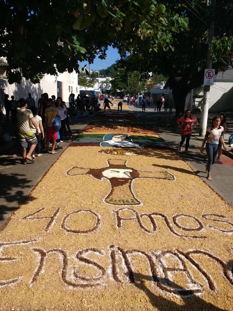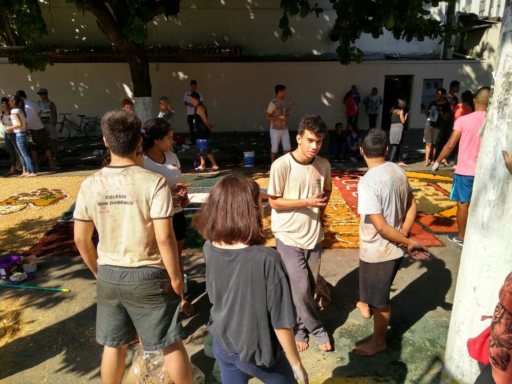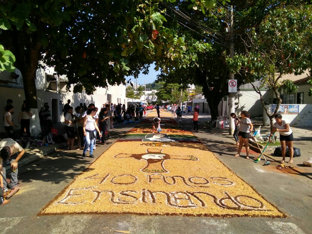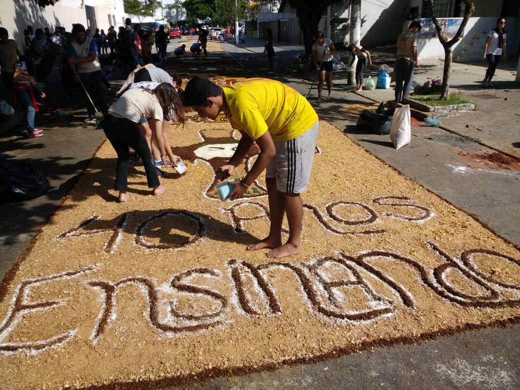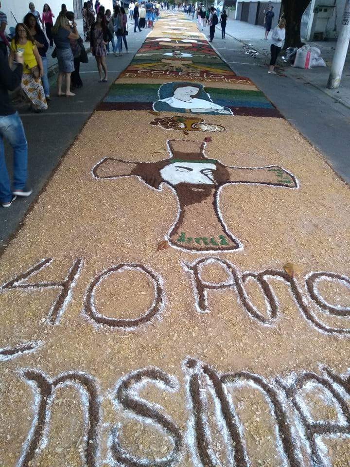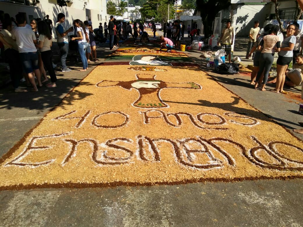 Na última quinta-feira (31/05), alunos do Colégio Don Domênico foram até a Igreja Matriz participar da confecção dos tapetes de Corpus Christi acompanhados pela professora de Artes Ana Cristina. “Os alunos confeccionaram 2 tapetes que depois se juntaram e formaram apenas 1, também fizemos uma homenagem ao Colégio Don Domênico que neste ano comemora seus 40 anos, expondo a frase ‘40 anos ensinando’ em um dos tapetes”.