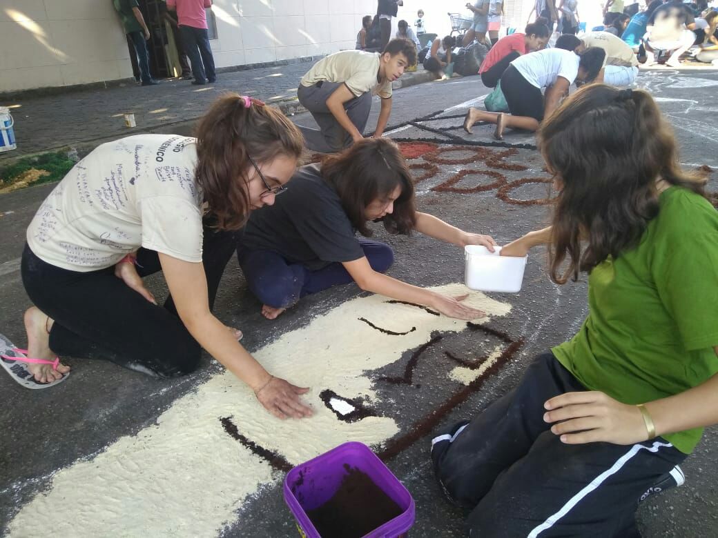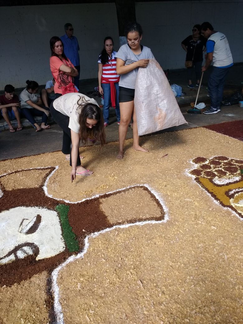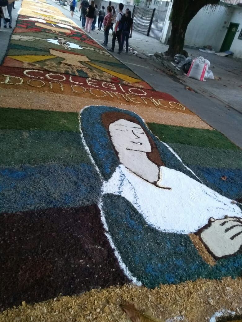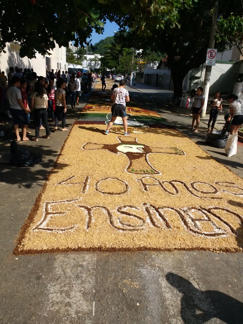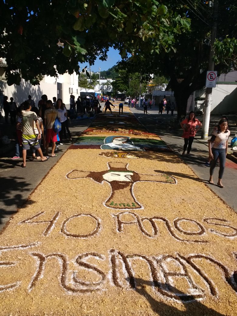 Na última quinta-feira (31/05), alunos do Colégio Don Domênico foram até a Igreja Matriz participar da confecção dos tapetes de Corpus Christi acompanhados pela professora de Artes Ana Cristina. “Os alunos confeccionaram 2 tapetes que depois se juntaram e formaram apenas 1, também fizemos uma homenagem ao Colégio Don Domênico que neste ano comemora seus 40 anos, expondo a frase ‘40 anos ensinando’ em um dos tapetes”.