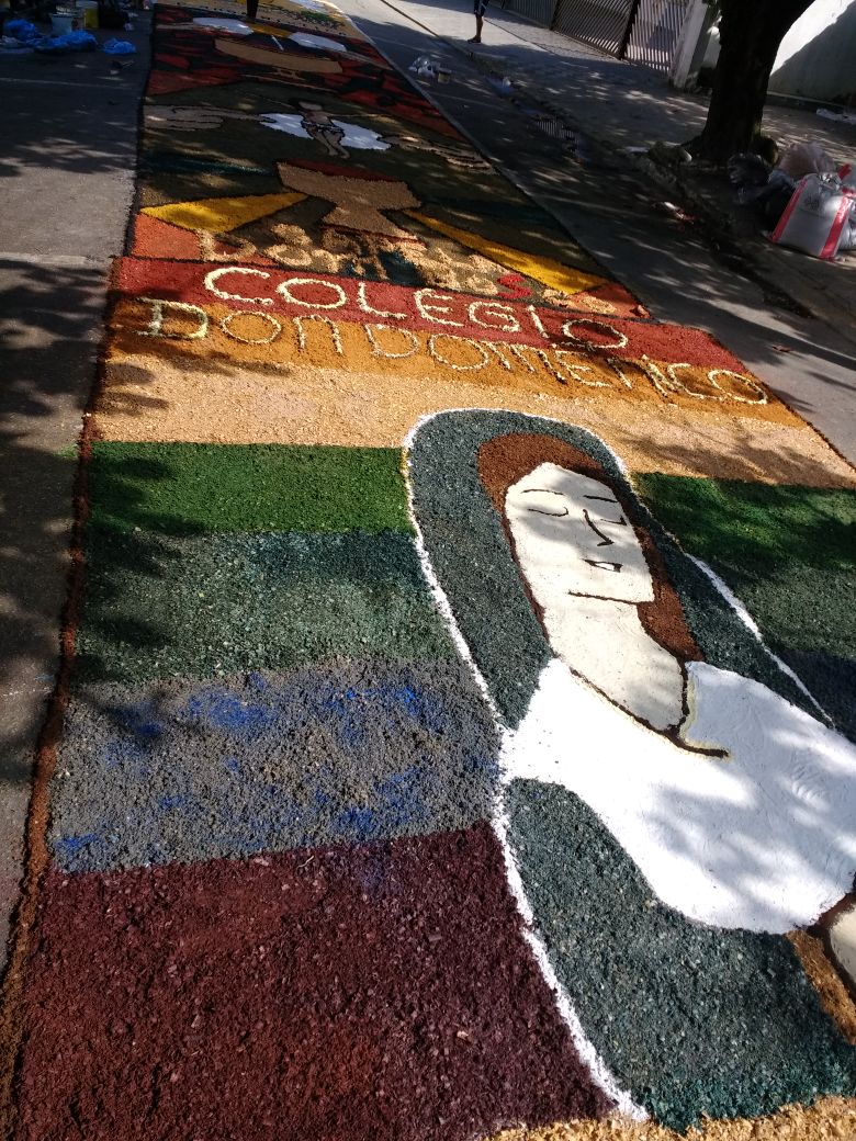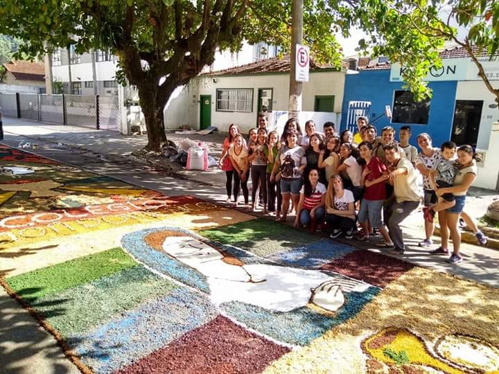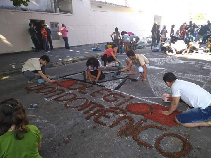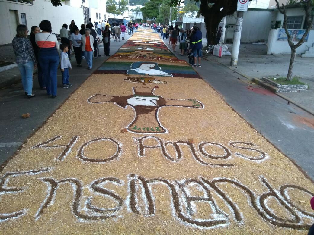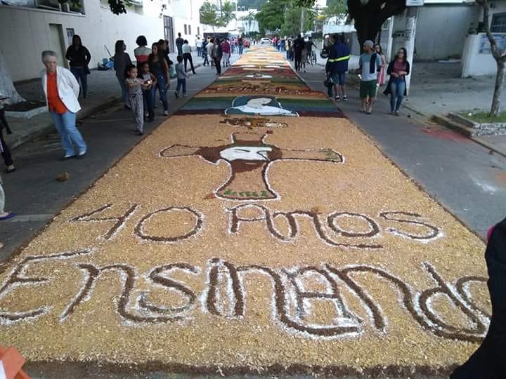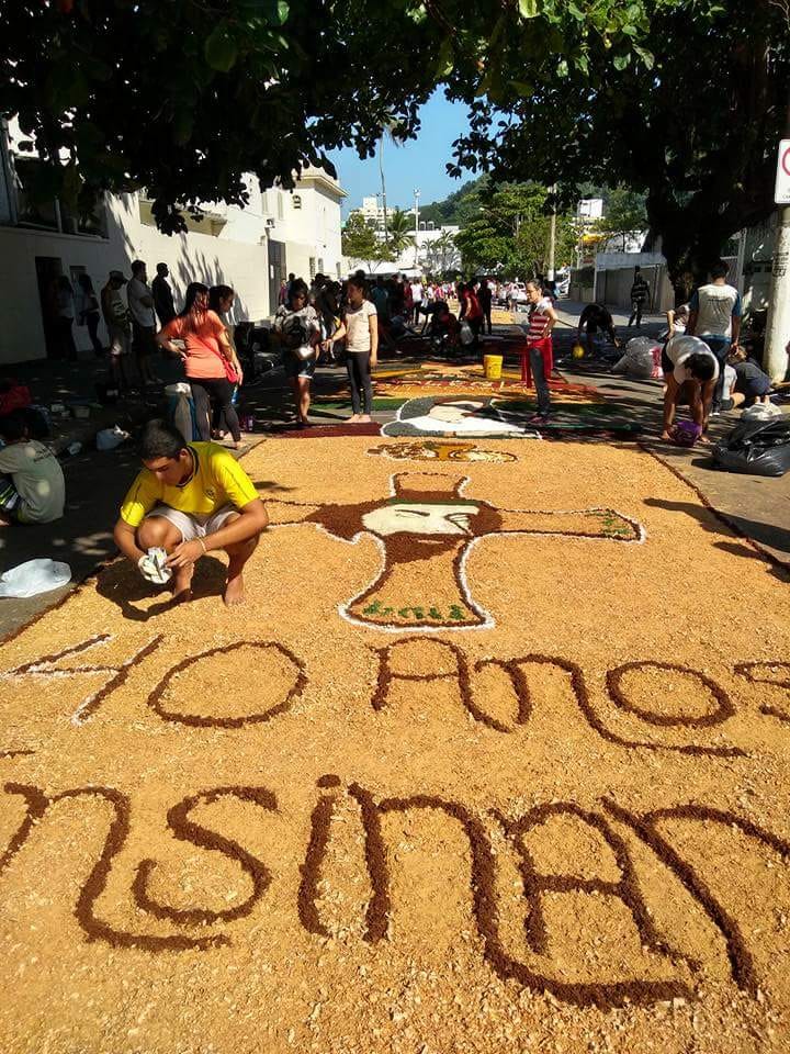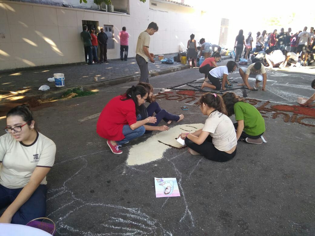 Na última quinta-feira (31/05), alunos do Colégio Don Domênico foram até a Igreja Matriz participar da confecção dos tapetes de Corpus Christi acompanhados pela professora de Artes Ana Cristina. “Os alunos confeccionaram 2 tapetes que depois se juntaram e formaram apenas 1, também fizemos uma homenagem ao Colégio Don Domênico que neste ano comemora seus 40 anos, expondo a frase ‘40 anos ensinando’ em um dos tapetes”.