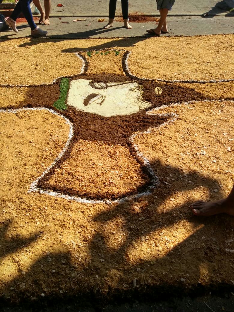 Foram utilizados como material no tapete: Serragem, pó de café, tampinhas de garrafa, fubá, fitas de papel, farinha e cal, materiais levados pelos alunos, que se encarregaram de fazer todo o trabalho, com a coordenação da professora Ana Cristina. “Os alunos desenvolveram todo o trabalho com muito carinho e dedicação”, afirmou.