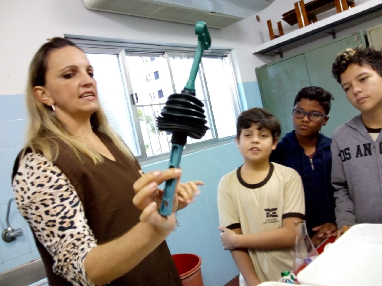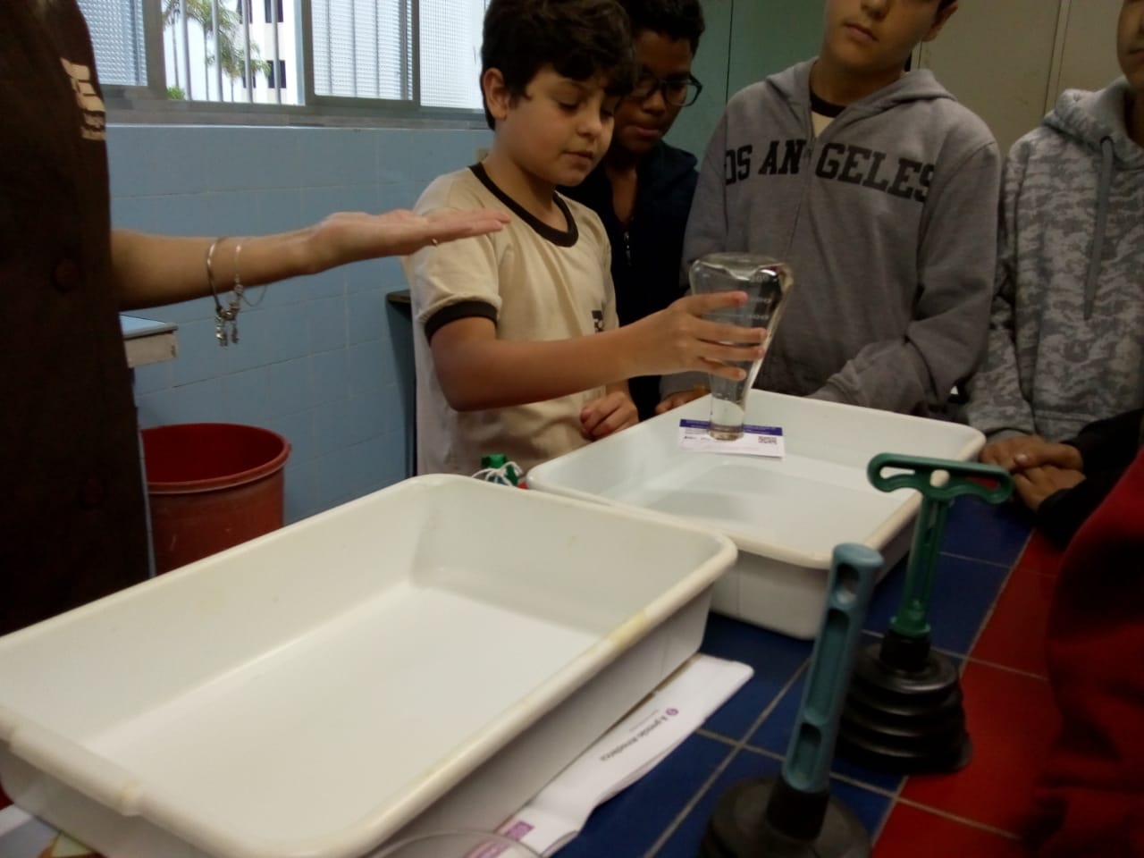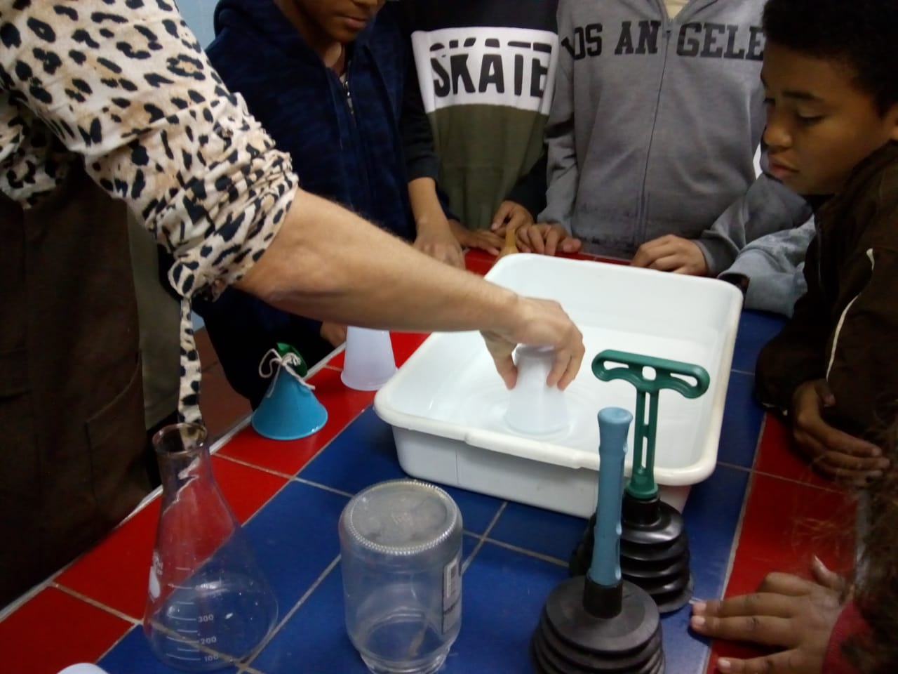 Já no 6AT, os alunos desenvolveram uma atividade prático sobre Pressão Atmosférica, utilizando algumas experiências. “Ao todo desenvolvemos três experiências. Na primeira, demonstramos a razão pela qual uma vela se apaga quando a colocamos no pote de vidro. Na sequência, utilizando um copo de água, a experiência demonstrou como a pressão do ar impede que a água do corpo caia. E, para finalizar, utilizamos um desentupidor de pia”.