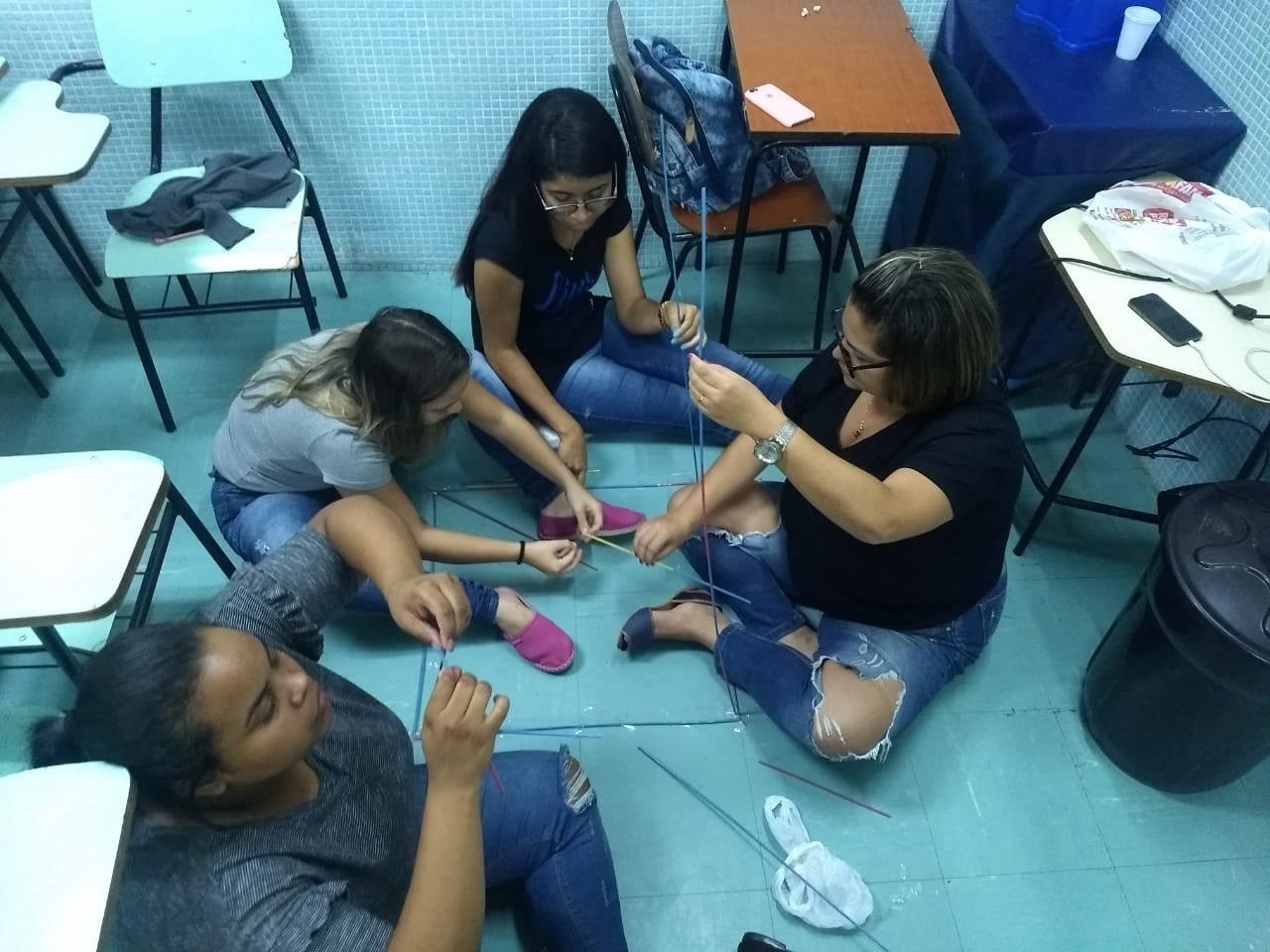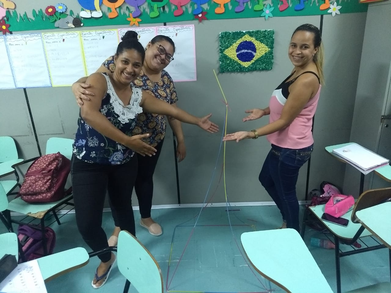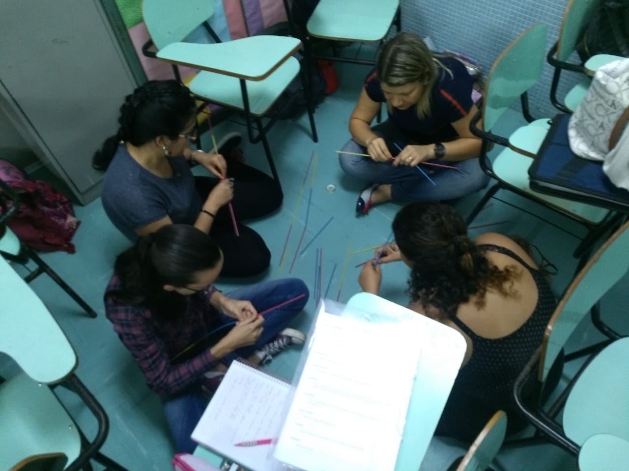 A mesma metodologia foi aplicada pelo Prof. José Tartanhar no 3º semestre de Pedagogia, onde os alunos trabalharam com a resolução de um problema estabelecido pelo professor e, mais tarde, finalizaram com a construção da pirâmide, utilizando canudos, fita crepe e barbante.