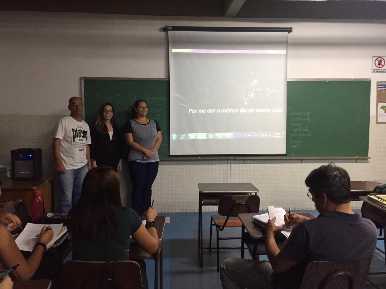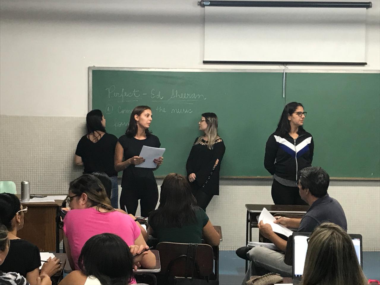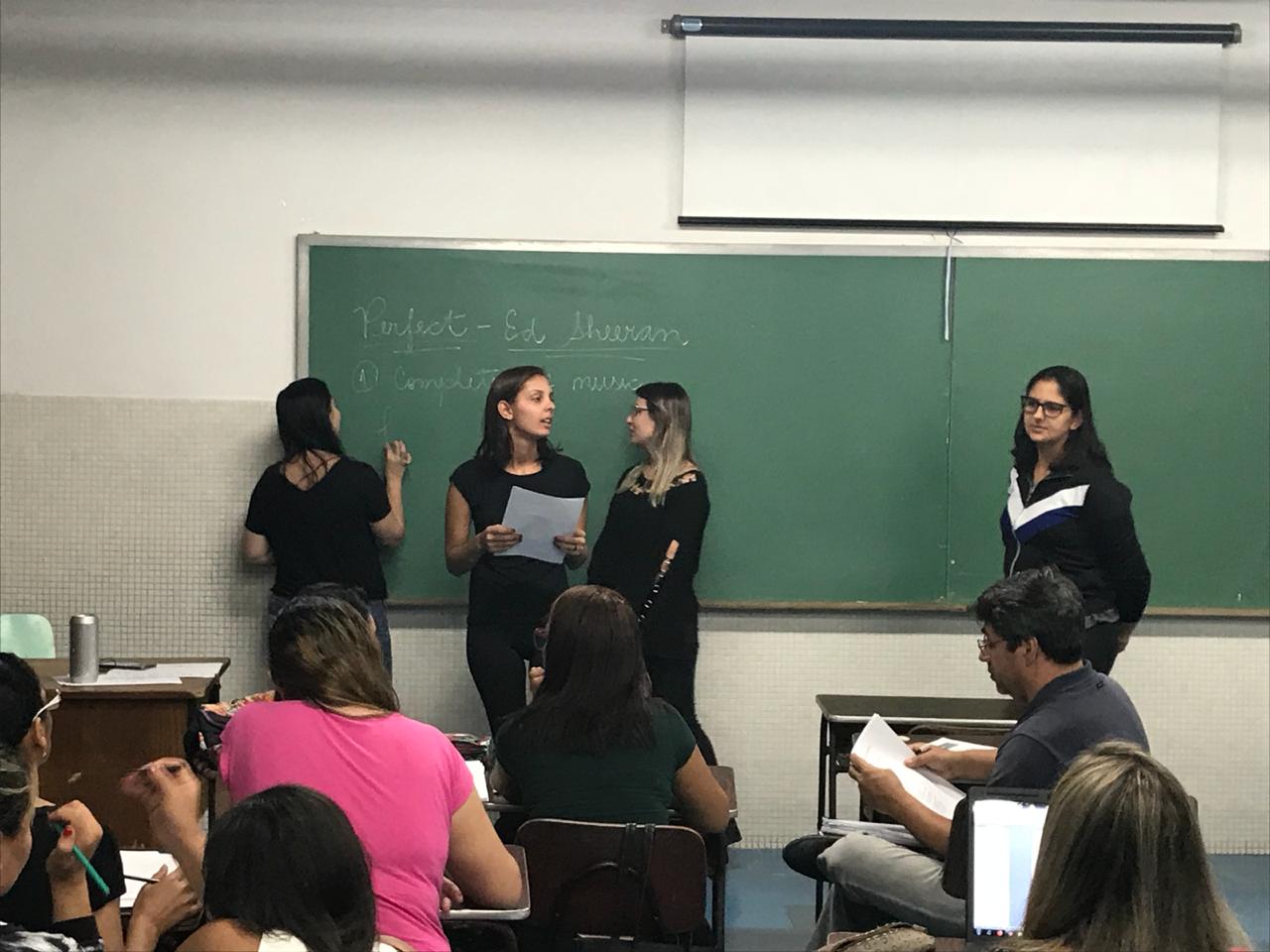 No 6º semestre de Letras, na disciplina Aspectos Sintáticos II- Inglês, a Profa. Mariza Cortazzio utilizou a metodologia Sala de Aula Invertida para consolidar aspectos importantes relacionados ao tema em discussão. “Os alunos foram orientados a preparar uma atividade com música para dar em sala de aula. A atividade deveria contar com três exercícios usando a música como referência”, destacou.