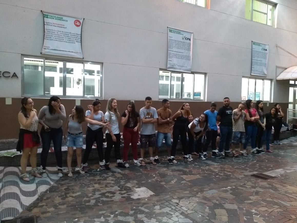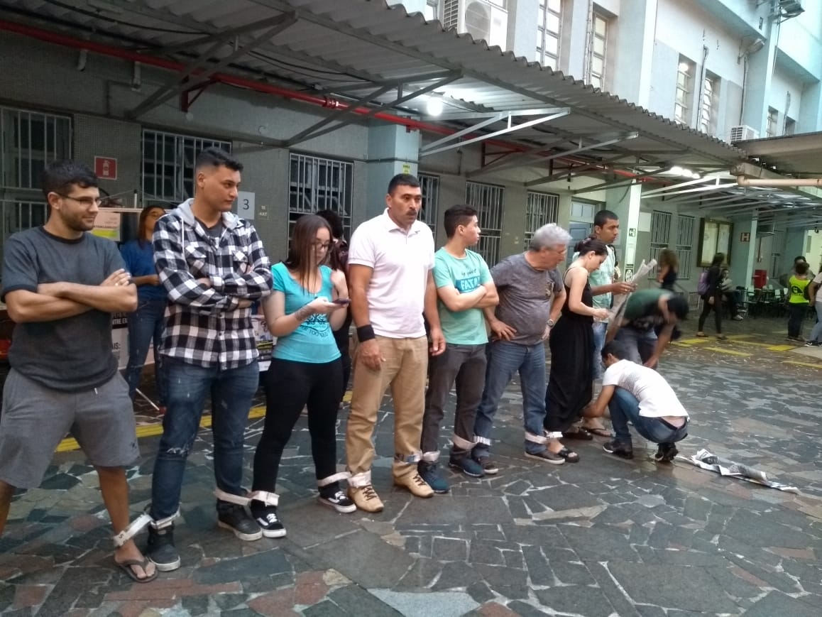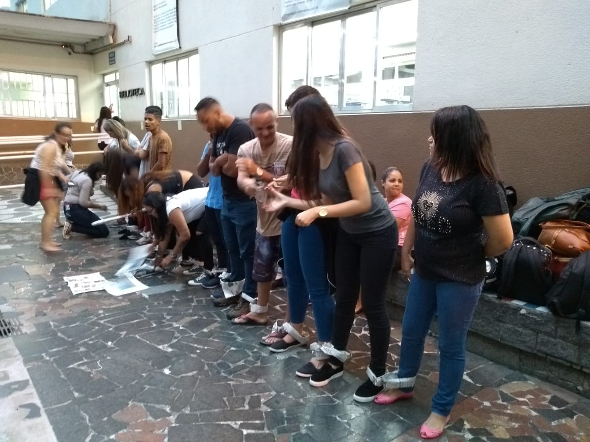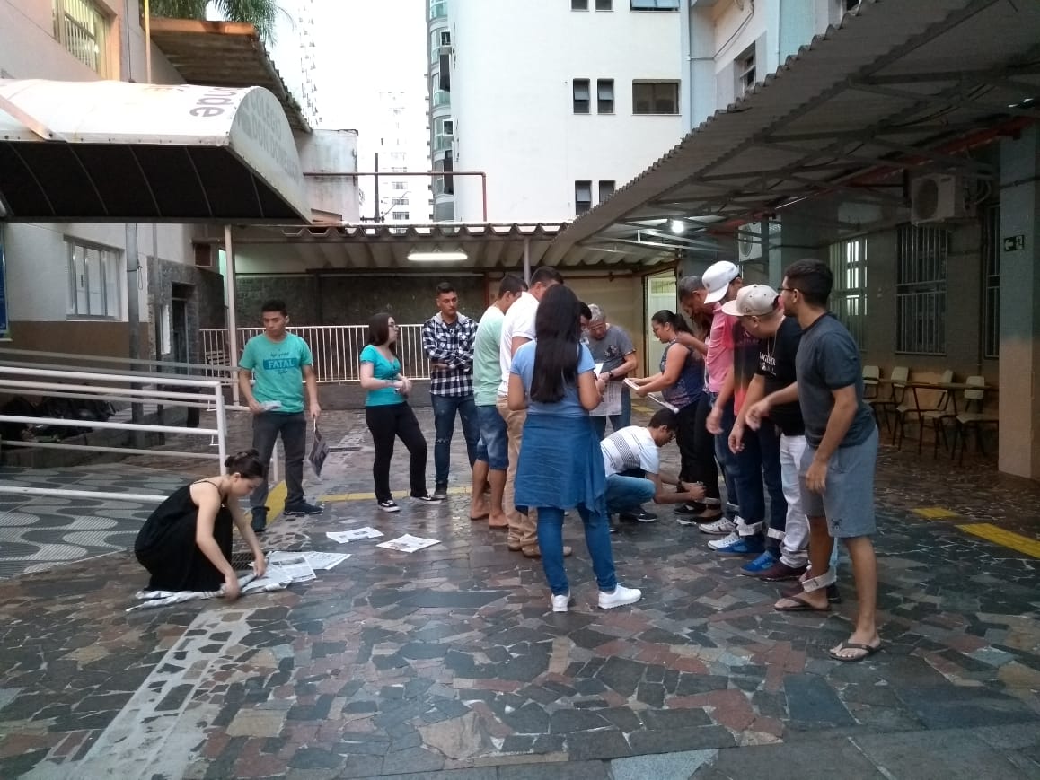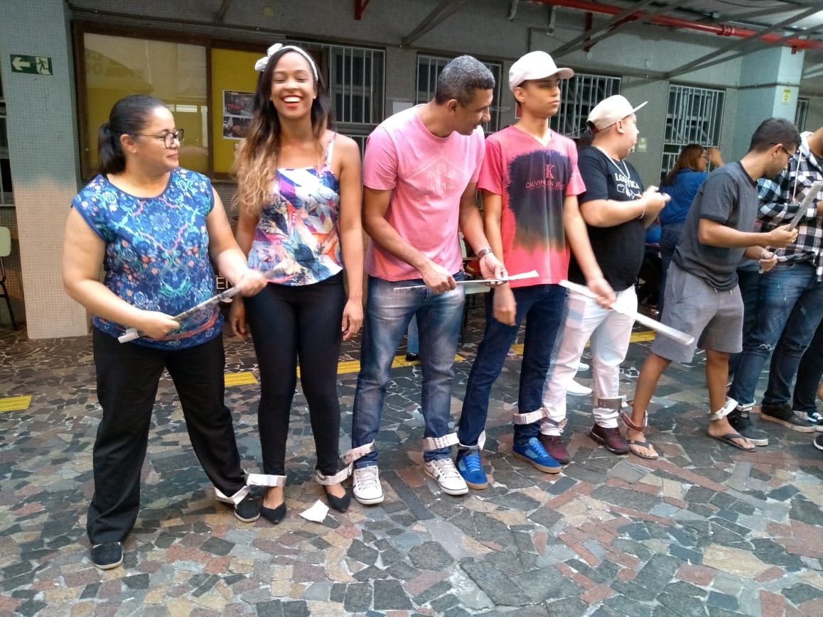 “A dinâmica consistiu na divisão da turma em dois grandes grupos que representavam dois turnos de trabalho na produção de uma empresa. Ambos os grupos receberam o mesmo material para produção: jornais, tesoura, durex, barbante e grampeador, e tiveram alguns minutos para decidir como fariam para realizar a produção de anéis de jornal que devem ser presos aos participantes formando uma fila”, explicou.