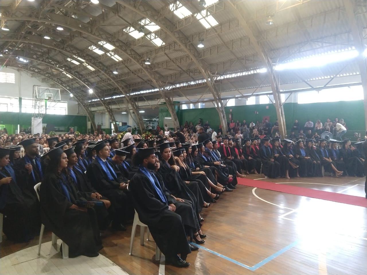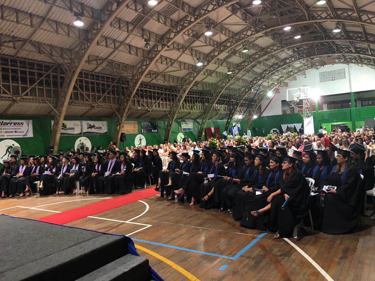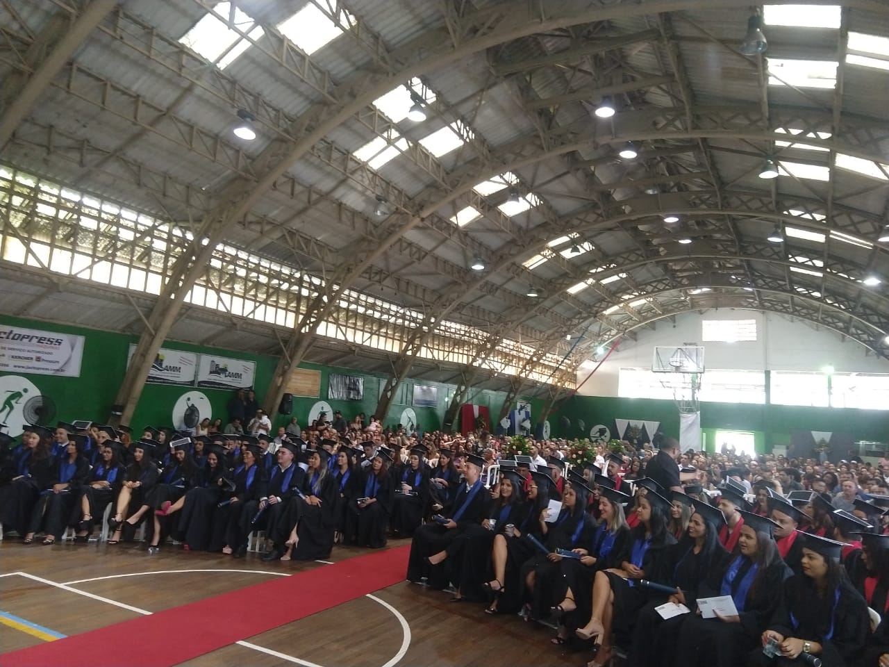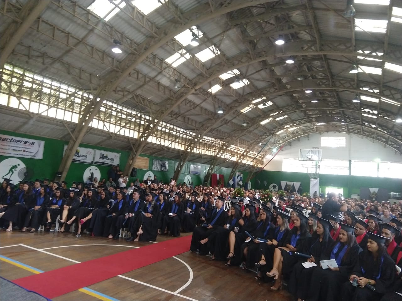 Aproximadamente 500 pessoas participaram da cerimônia que foi dividida em duas partes. Na primeira, os alunos de Administração e Ciências Contábeis receberam o grau e, na sequência, os alunos de Letras e Pedagogia. Excepcionalmente neste ano, a cerimônia ocorreu na sede do Vila Souza Atlético Clube, em razão de obras no Centro Esportivo Don Domênico.