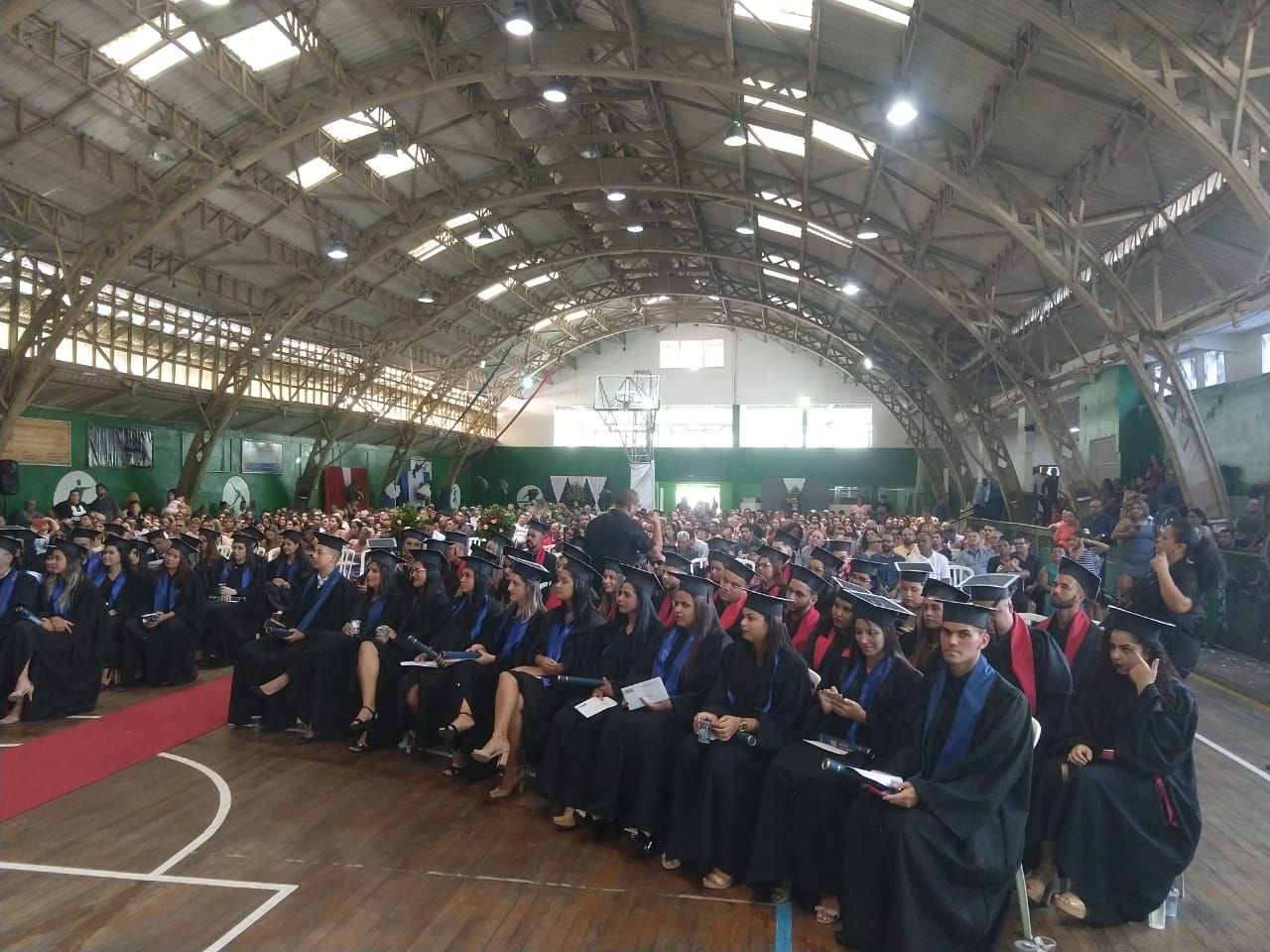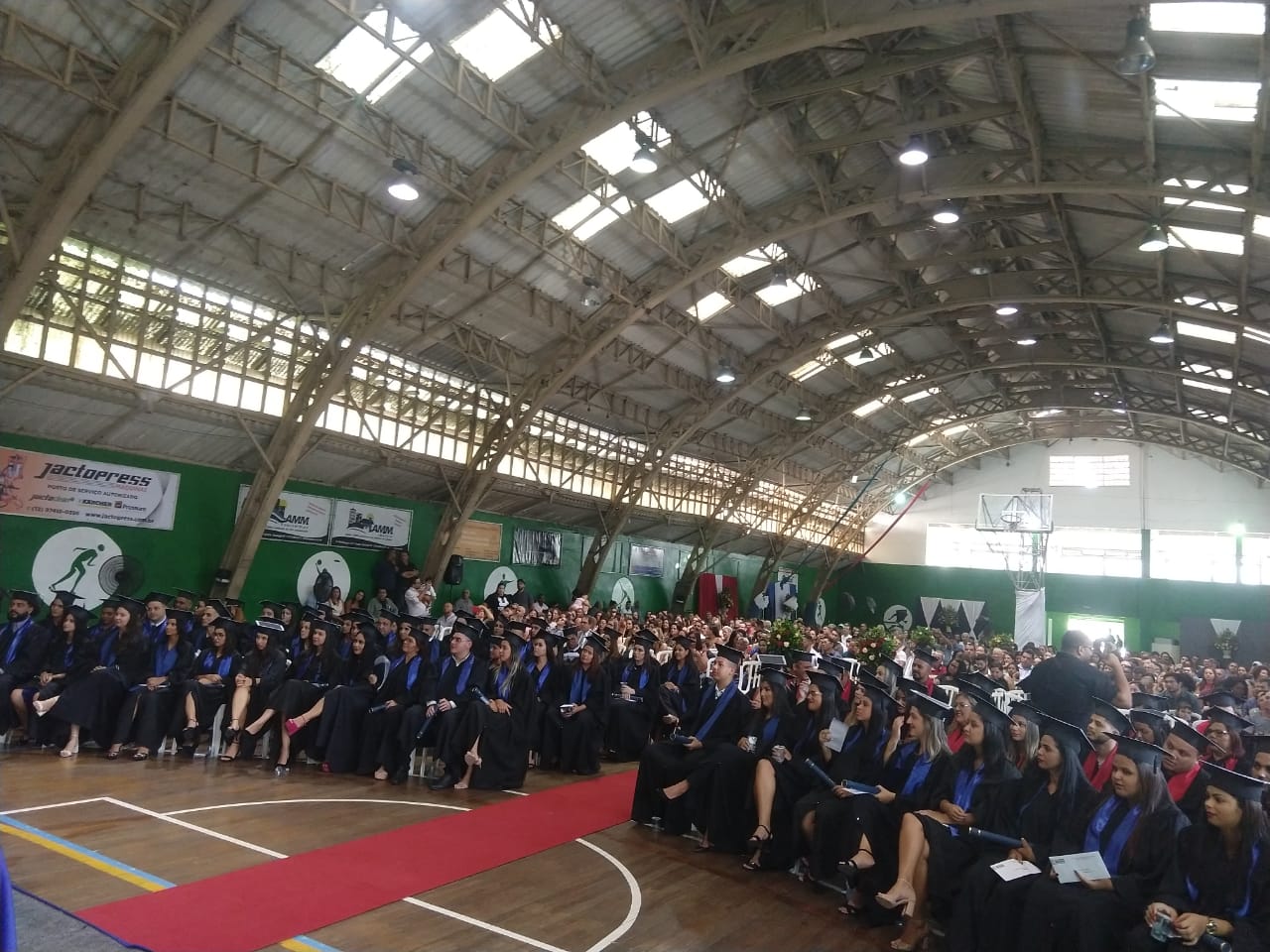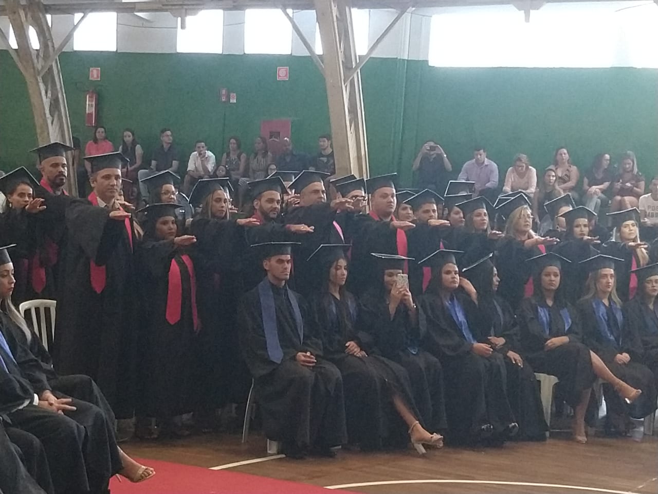 Aproximadamente 500 pessoas participaram da cerimônia que foi dividida em duas partes. Na primeira, os alunos de Administração e Ciências Contábeis receberam o grau e, na sequência, os alunos de Letras e Pedagogia. Excepcionalmente neste ano, a cerimônia ocorreu na sede do Vila Souza Atlético Clube, em razão de obras no Centro Esportivo Don Domênico.